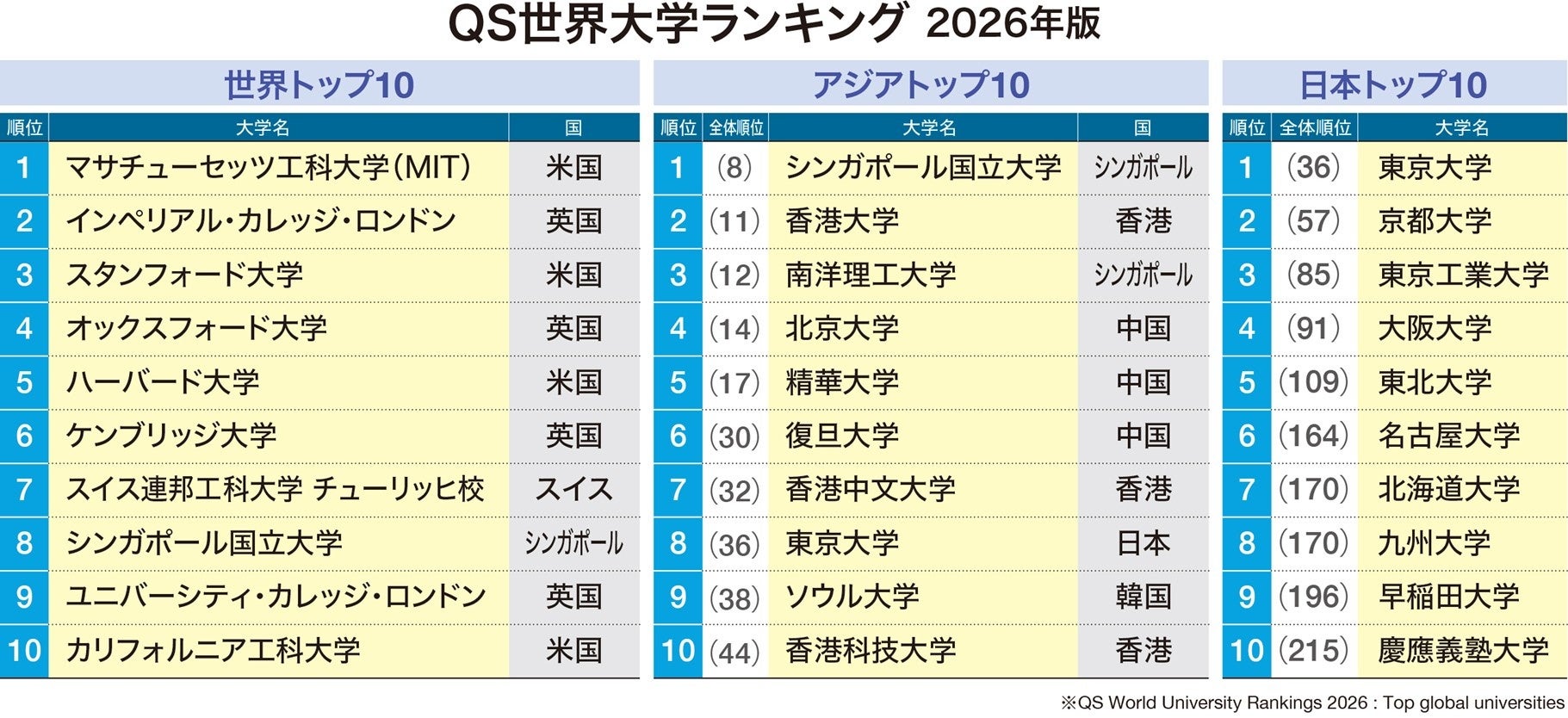 イギリスの大学評価機関「クアクアレリ・シモンズ社(QS)」が発表した「QS世界大学ランキング 2026年版」では、米国のMITやスタンフォード大、英国のオックスフォード大など、米英の大学がトップ10のうち8校を占めた。アジア最上位はシンガポール国立大の8位。日本は東京大が36位、京都大(57位)、東京工大(85位)、大阪大(91位)の4校のみが100位以内に入っている。