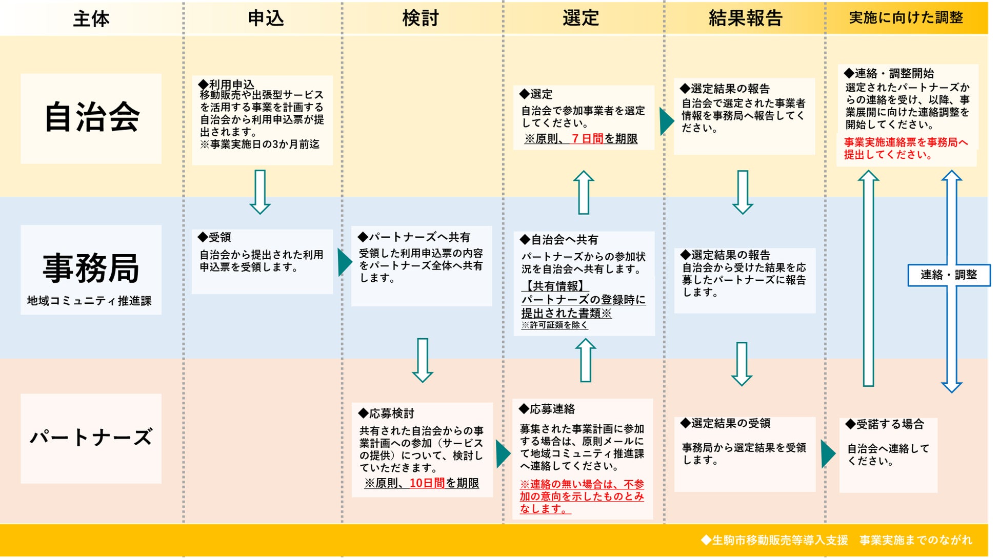 移動販売や地域での買い物や見守り活動・にぎわいづくりを支援するため、移動販売・出張型サービスを提供する事業者等(生駒市移動販売等支援パートナーズ(通称:パートナーズ))と自治会をマッチングさせる「生駒市移動販売等導入支援事業」を4月から始めます。