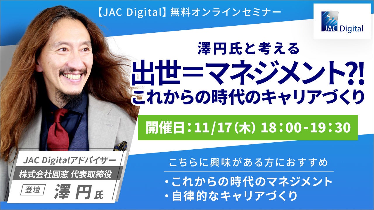 また、これからの時代に求められるマネジメントとは何か、マネジメントに向いているのはどんな人かを、世界的外資IT企業の業務執行役員として活躍されたJAC Digitalアドバイザー澤円氏の経験談をまじえながら考えていきます。