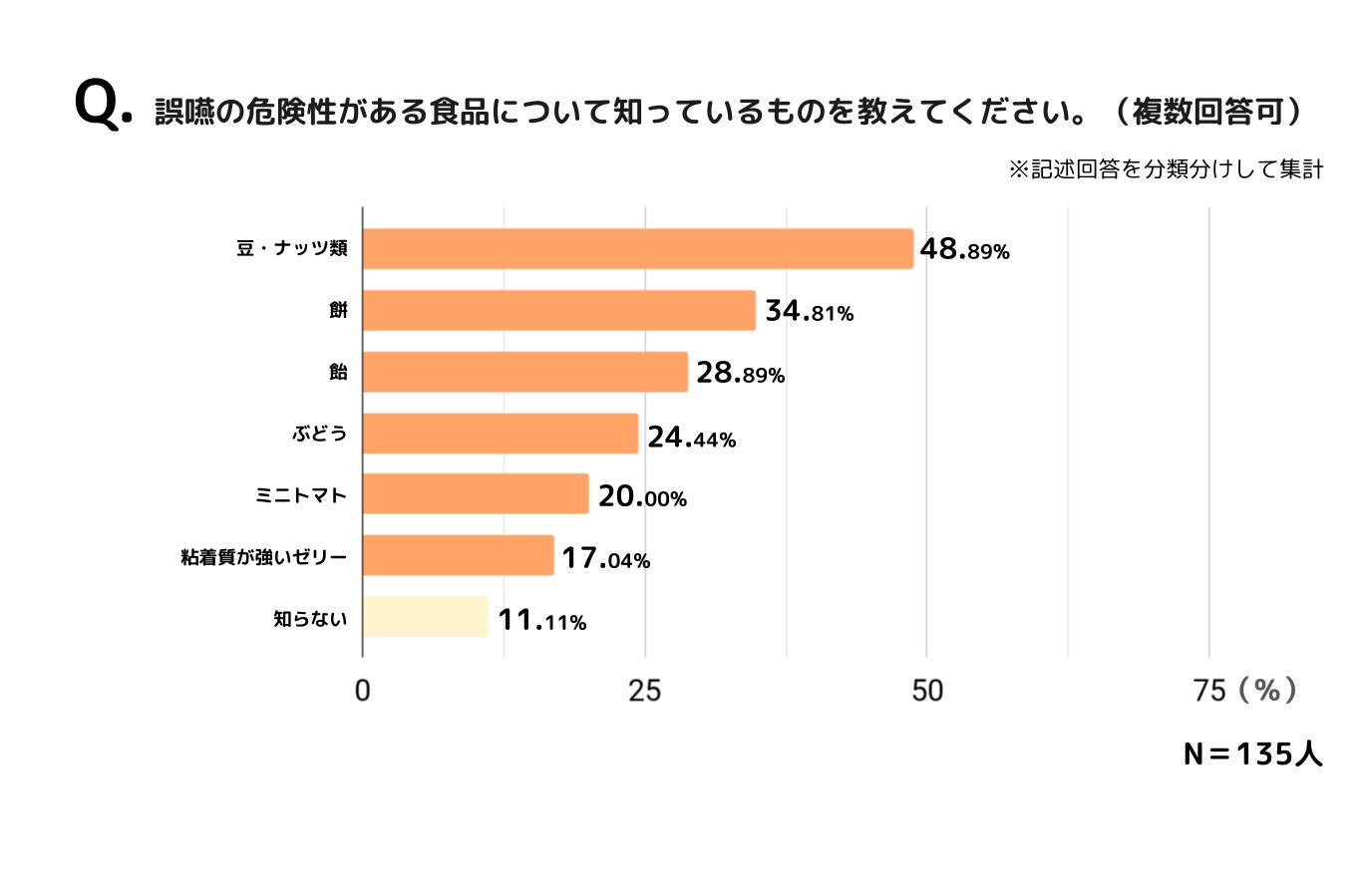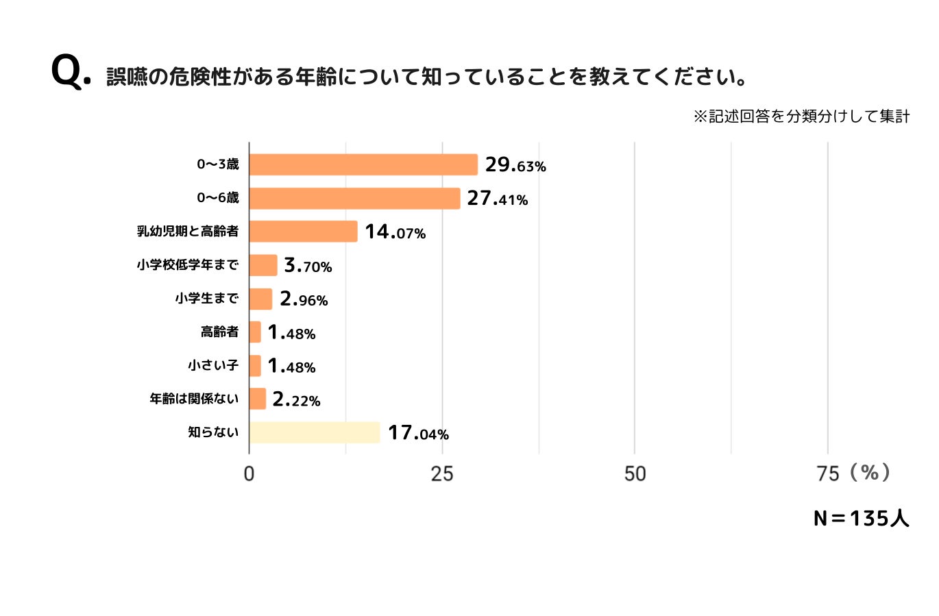 誤嚥の危険性がある年齢を知っているかについては、「0~3歳(29.63%)」「0~6歳(27.41%)」「乳幼児と高齢者(14.07%)」という結果で、80.74%が年齢を回答しました。総じて、誤嚥の危険性について保護者は何らかの知識を持っている傾向にあることが分かりました。