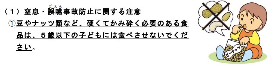 調査の結果、誤嚥の危険性がある食品を知っているかという質問に対しては、「豆・ナッツ類(48.89%)」「餅(34.81%)」「飴(28.89%)」という回答で、88.89%が一つ以上の食材をあげました。また、家庭で誤嚥について気を付けていることはあるかという質問に対して、「月齢や年齢に適した食べ物を与えている(74.81%)」が一番多く、「特にない」と回答したのは僅か5.19%で、大多数が誤嚥に気を付けていることが分かる結果となりました。