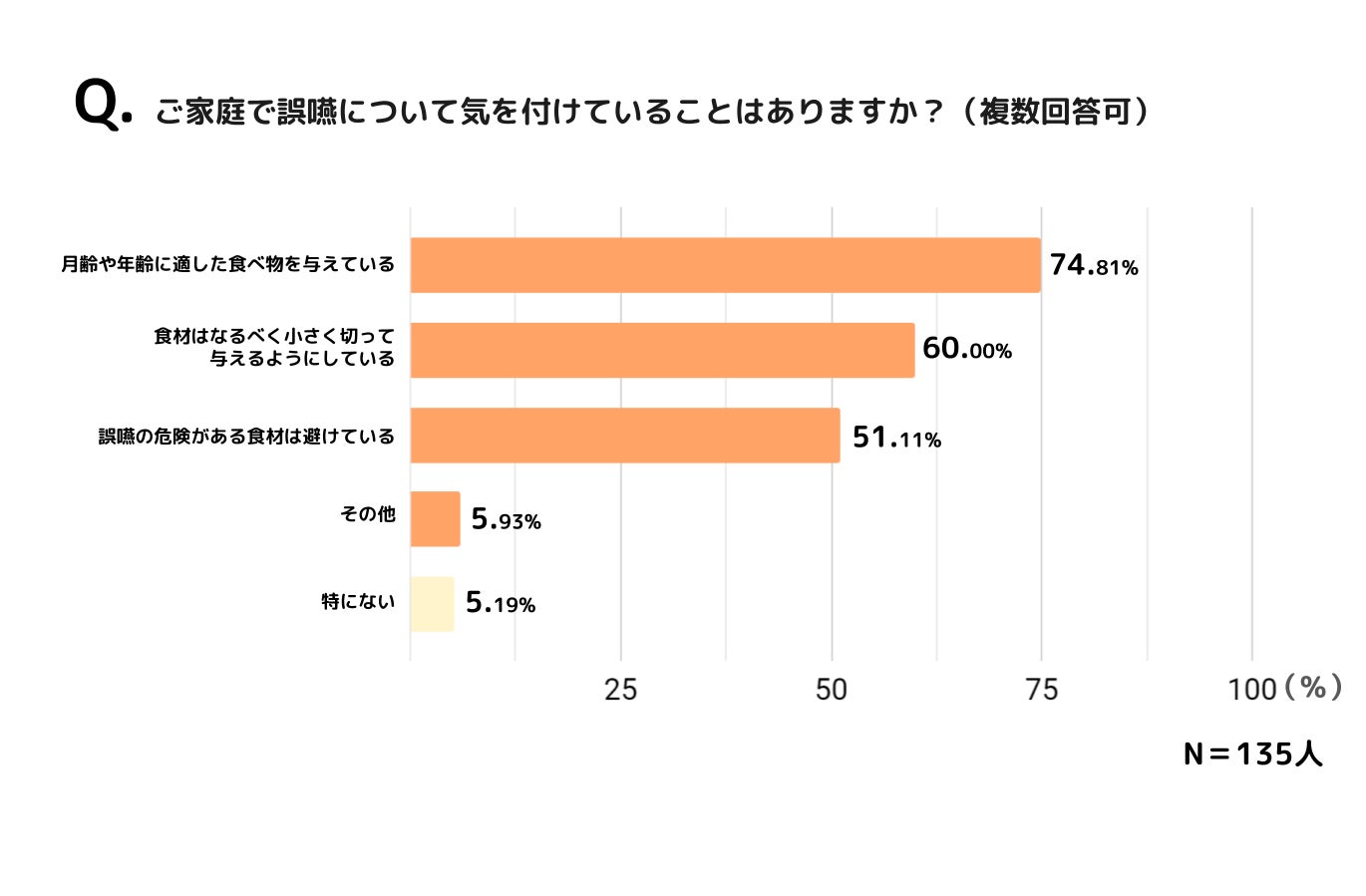 また、家庭で誤嚥について気を付けていることはあるかという質問に対して、「月齢や年齢に適した食べ物を与えている(74.81%)」が一番多く、「食材はなるべく小さく切って与えるようにしている(60.00%)」「誤嚥の危険がある食材は避けている(51.11%)」が続く結果となりました。「特にない」と回答したのは5.19%で、大多数が誤嚥に気を付けていることが分かる結果となりました。