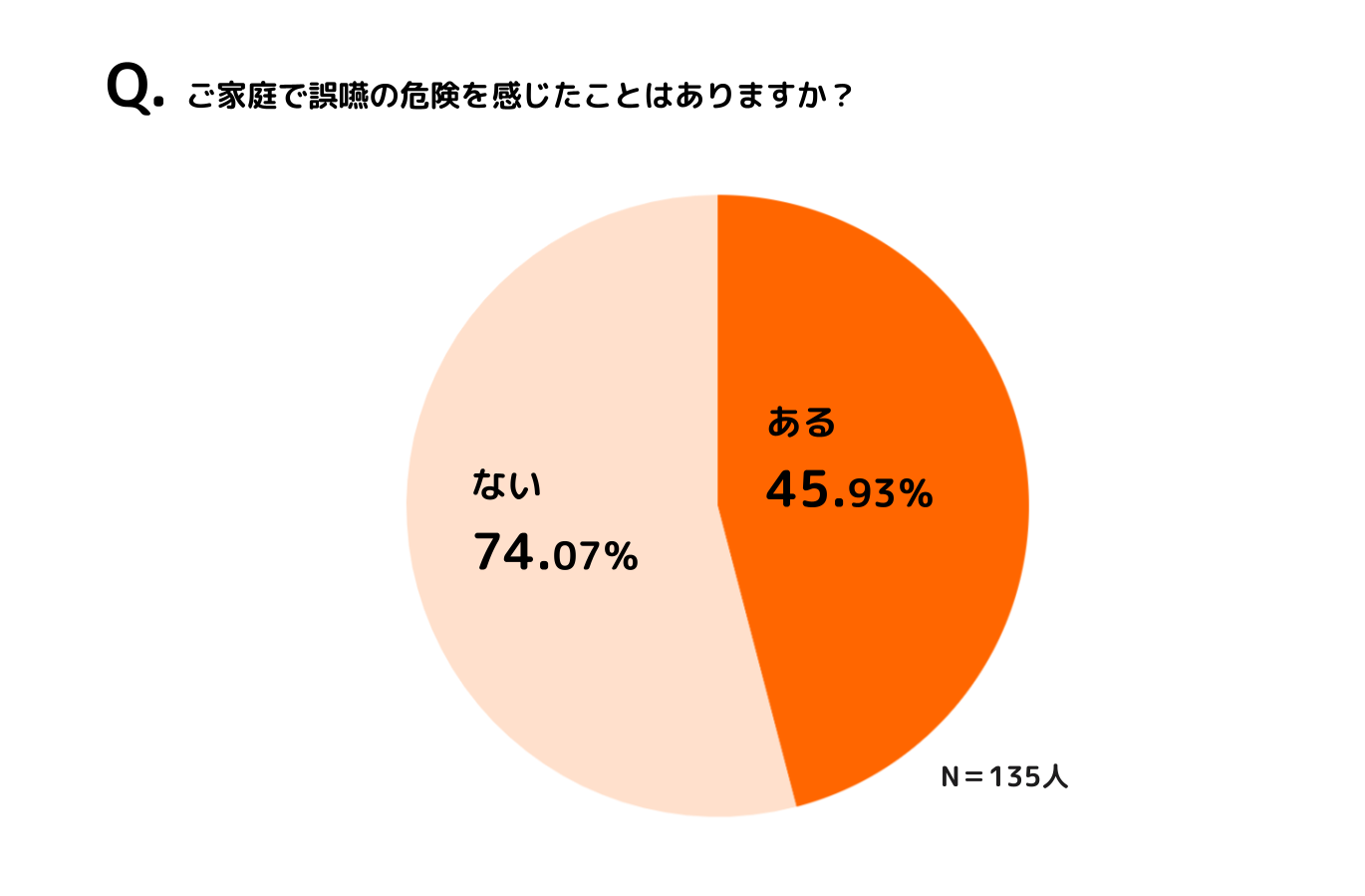 しかし一方で、45.93%が「家庭で誤嚥の危険を感じたことがある」と答えています。多くの保護者が誤嚥の危険性を認識し、何かしら気を付けて生活している傾向にありながらも、半数近くが誤嚥の危険を感じたことがあるという結果になりました。