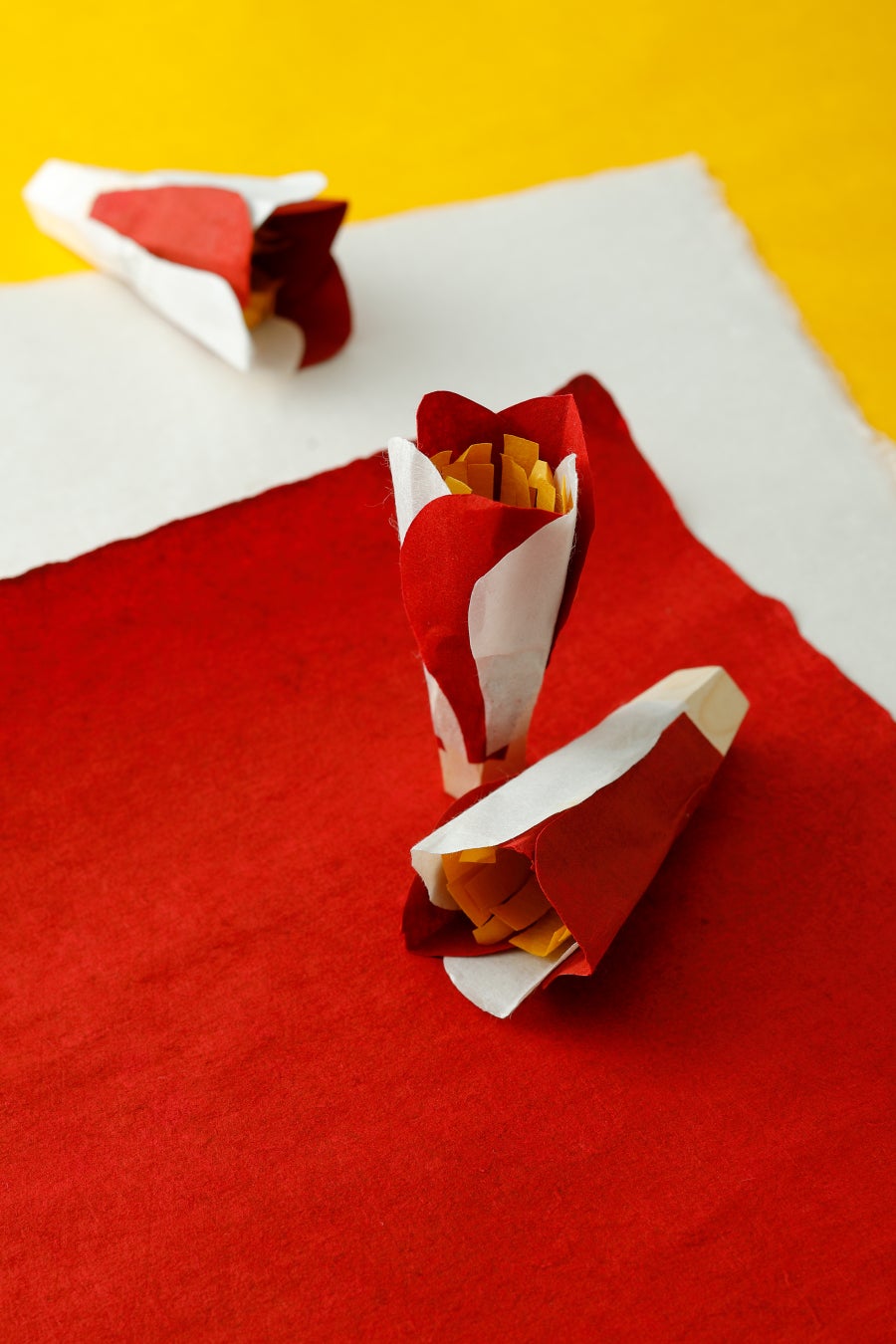 伝統的な技法が失われることを危惧した四代目・吉岡常雄と五代目・吉岡幸雄は、古染織品や染料の研究に取り組み、植物染めによる日本の伝統色を復活させます。そして六代目・吉岡更紗に引き継がれる「染司よしおか」の植物染めの技法は、薬師寺の伎楽(ぎがく)装束をはじめとする古代の作品の復元や、毎年行われる東大寺修二会(しゅにえ)の椿の染和紙の制作などの古社寺の伝統行事を支えています。