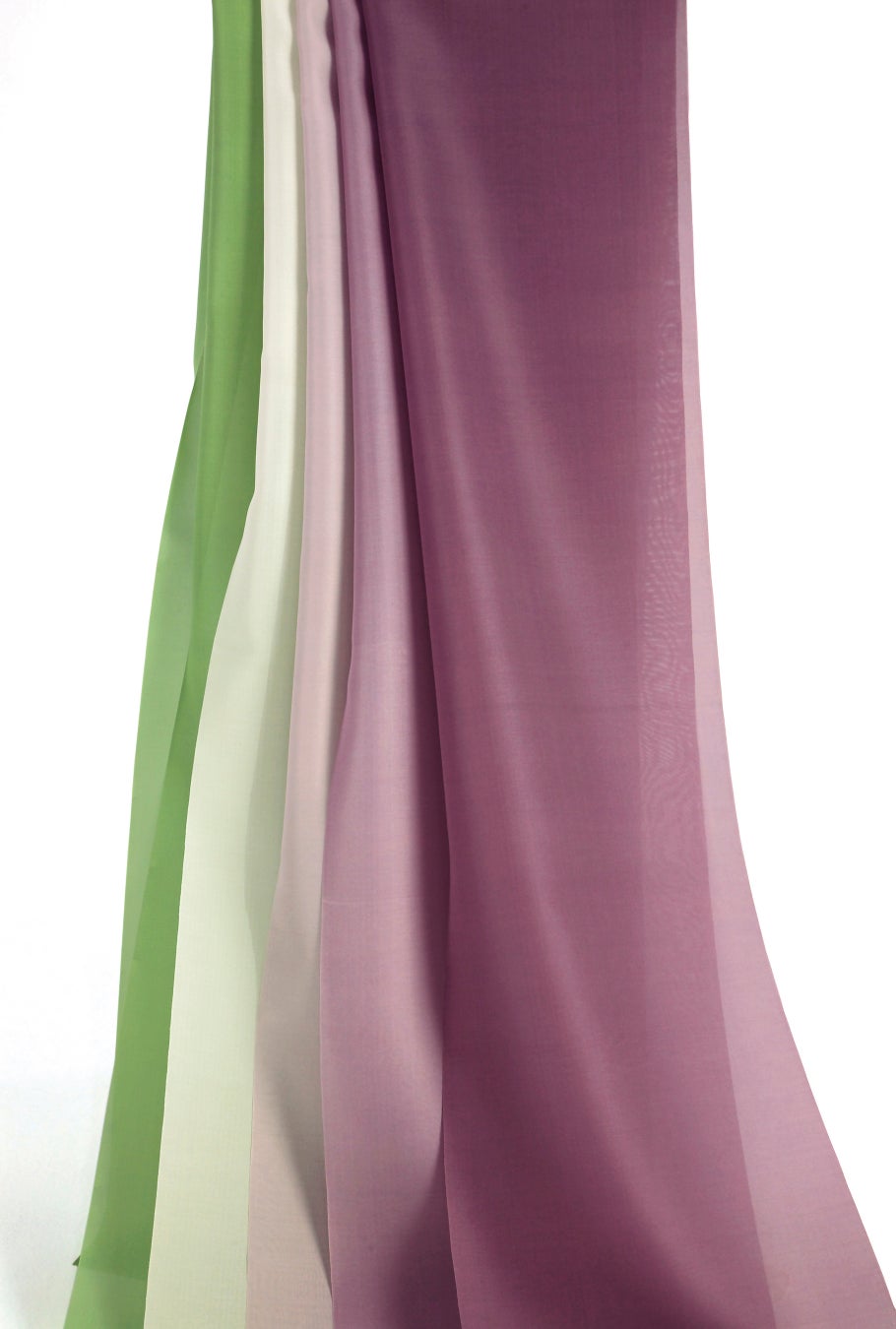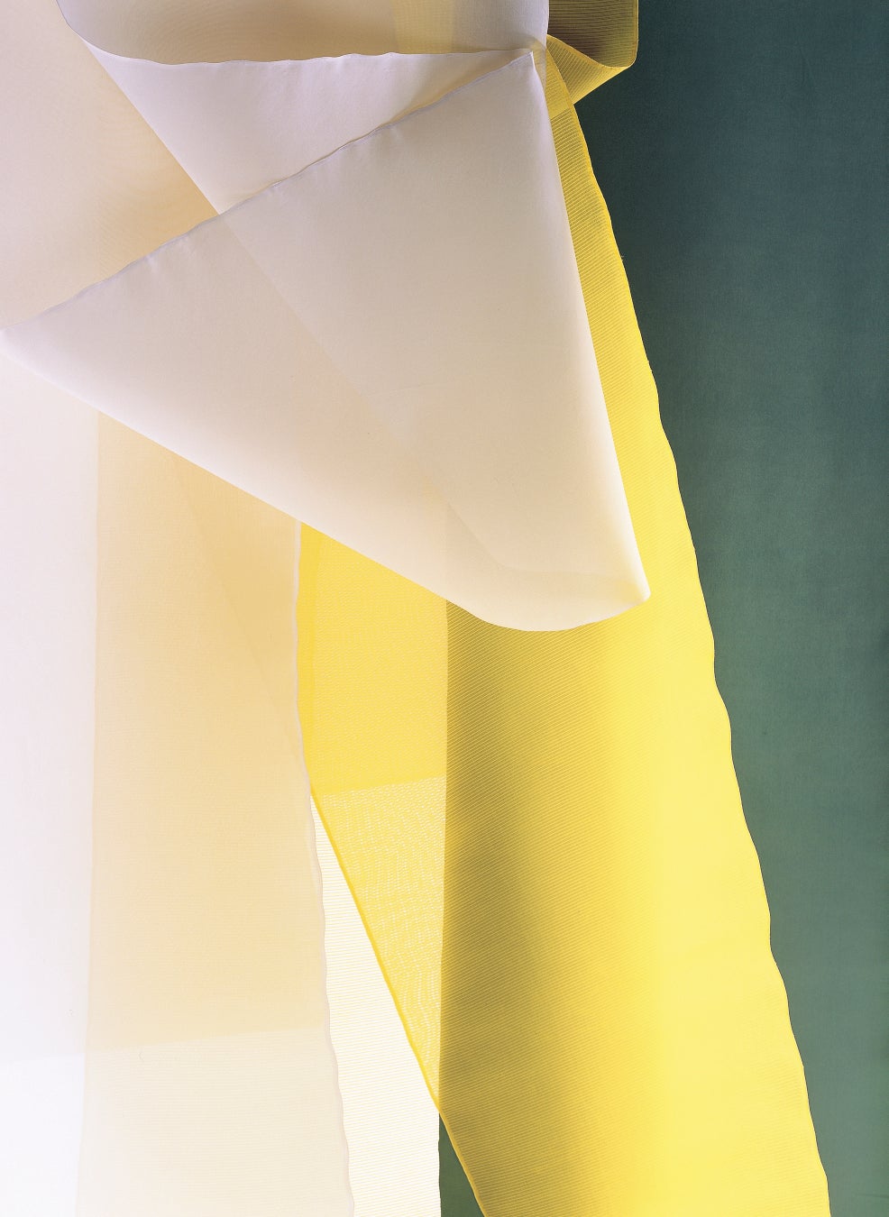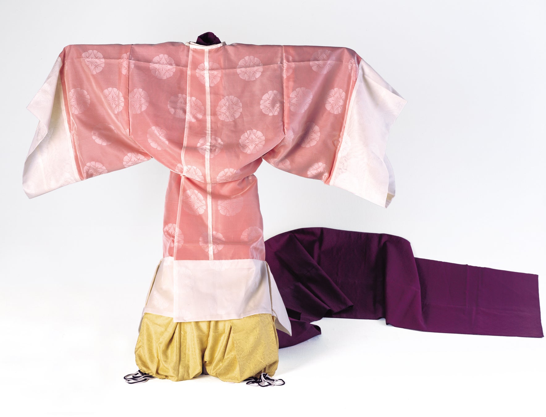 日本独自の美意識が育まれた平安時代の宮中では、高貴な人物が身に着ける着物の色彩の組み合わせに自然界の色の移り変わりが取り入れられました。特に十二単(ひとえ)のような宮中の女性装束では、季節に合った色を襟や袖口、裾から垣間見える着物に取り合わせる「かさねの色目(いろめ)」を楽しみました。『源氏物語』の中にも季節に合わせて美しい衣裳をまとう平安時代の貴族たちの姿が多く描かれています。「染司よしおか」は、『延喜式(えんぎしき)』といわれる律令制度について記した10世紀の法典を手掛かりに、『源氏物語』の登場人物たちがまとった美しい衣裳が織りなす色彩世界をよみがえらせました。