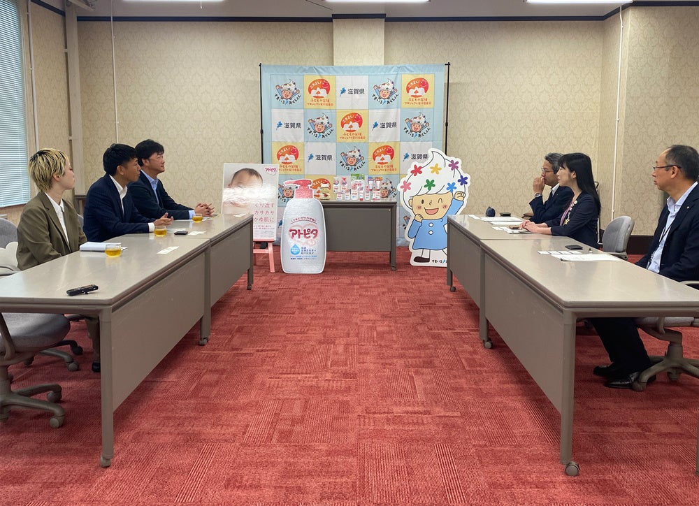 丹平製薬から滋賀県へ目録を贈呈し、赤ちゃんやそのご家族を支える取り組みについて意見交換いたしました。丹平製薬から「アトピタは、毎日のスキンケアを通して赤ちゃんとそのご家族の笑顔あふれる毎日を応援したいとの想いで活動しています。スキンケアを通し、滋賀県で生まれた赤ちゃんとそのご家族の肌の悩みに寄り添い、皆様の笑顔に繋げていきたい」と想いをお伝えしました。滋賀県 子ども若者部 村井部長からも「滋賀県では、こどもたちの笑顔はもちろん子育てに携わるご家族が少しでも子育てしやすい環境を社会全体で作っていきたいとの想いで、「滋賀で誕生ありがとう事業」を実施しています。今回の「ありがとうの贈りもの」をきっかけに、こどもやそのご家族のために一緒に取り組んでいきたい」と想いを述べられました。