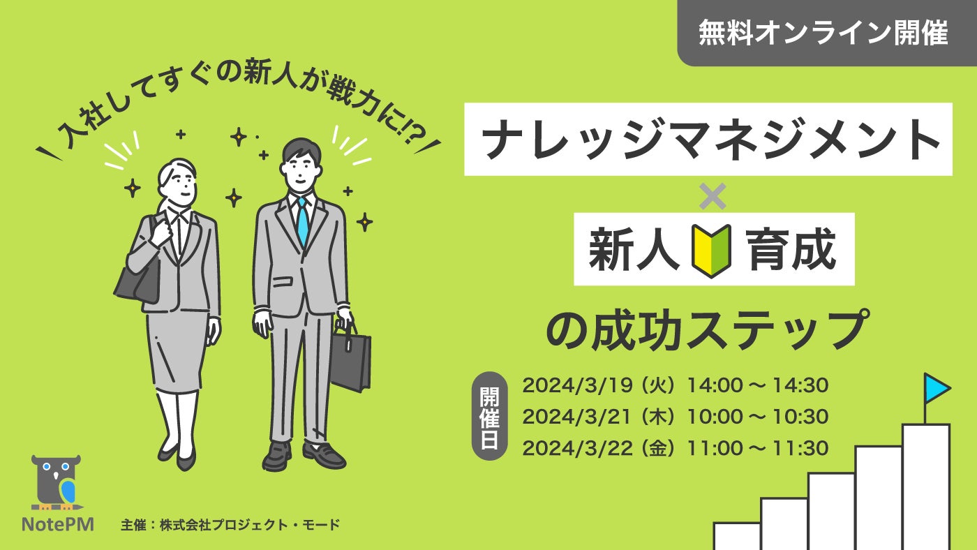 株式会社プロジェクト・モードが提供するナレッジマネジメントSaaS「NotePM ( https://notepm.jp )」は、オンラインセミナー『入社してすぐの新人が戦力に!? ナレッジマネジメント×新人育成の成功ステップ』を開催いたします。