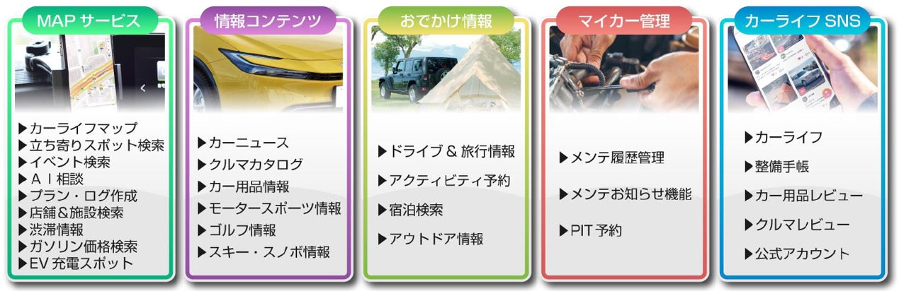 このたび、見ているだけで出かけたくなる「カーライフMAP」機能を追加し、より楽しく、より快適なお出かけを提案・サポートいたします。カーライフMAPは、株式会社イベントバンクや株式会社マップルなどとの連携により、日本全国の観光・イベント・飲食店情報、桜の開花や紅葉、イルミネーション情報などリアルタイムの季節情報を地図上に画像付きで表示します。細かく設定されたジャンルの中から欲しい情報を選択し、自分だけのオリジナルマップを表示させることができます。事前に情報収集するだけでなく、リアルタイムに周辺情報や立ち寄りスポットを表示することで、行先が決まっていない場合や見知らぬ土地でのドライブも安心して快適に楽しめます。