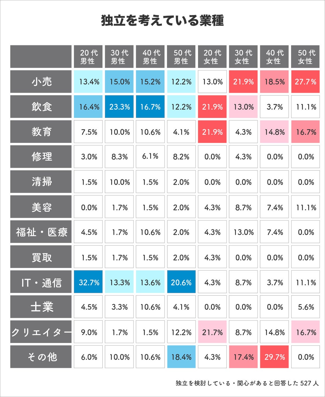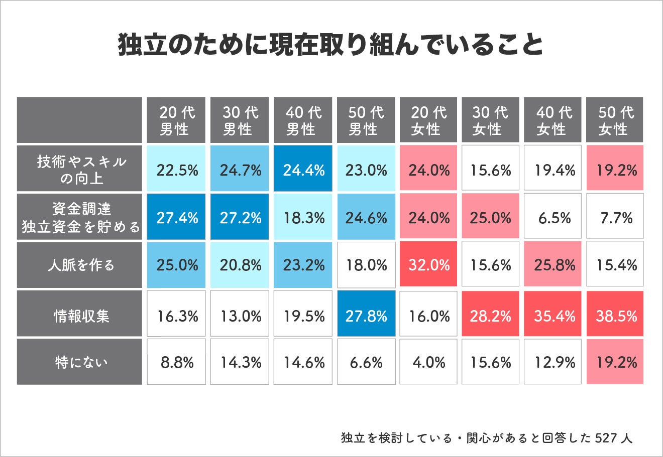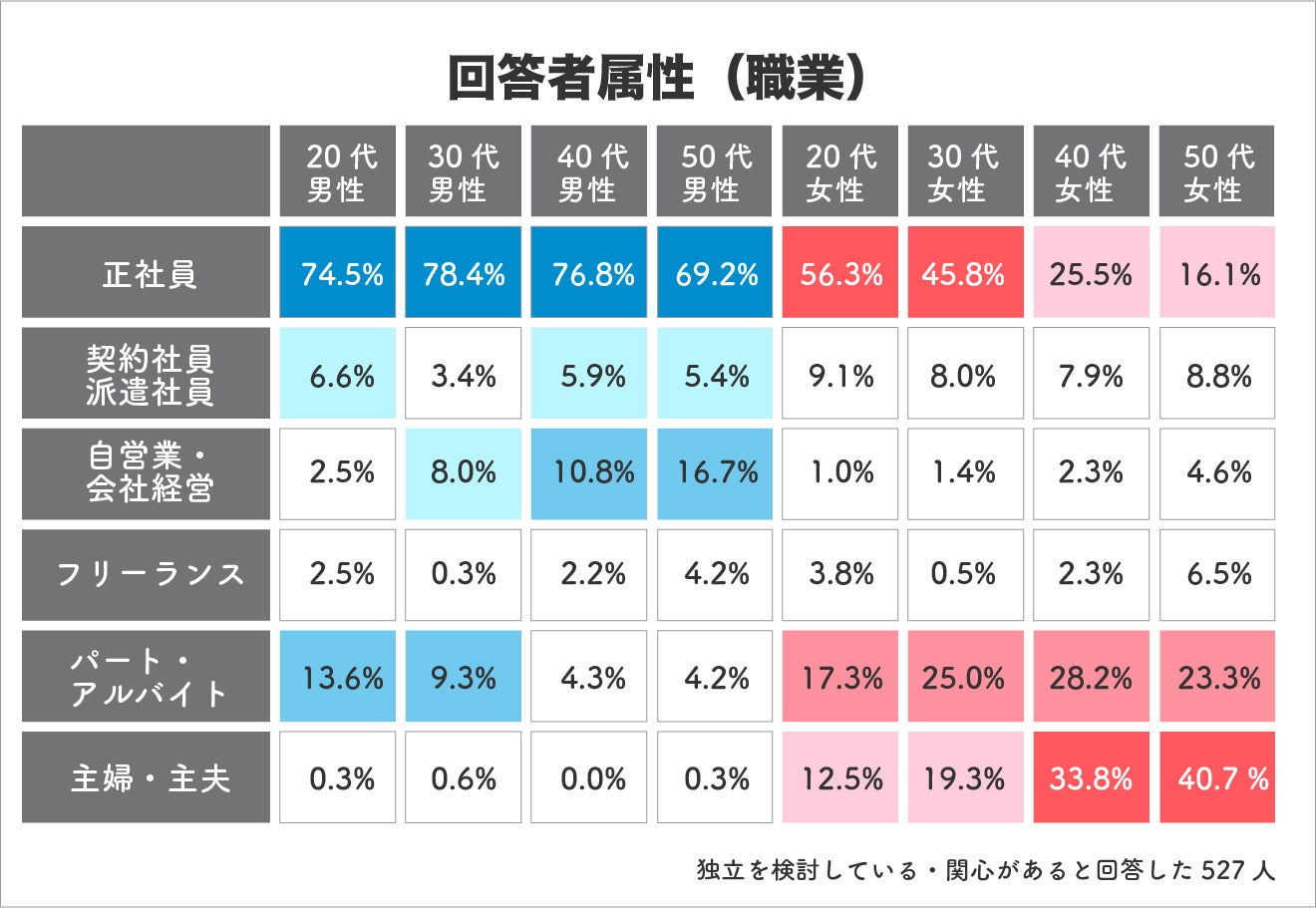 ここからは、「独立予定」「独立に関心がある」と回答した20代〜50代の男女527人を対象に調査を行なった結果をご紹介していきます。