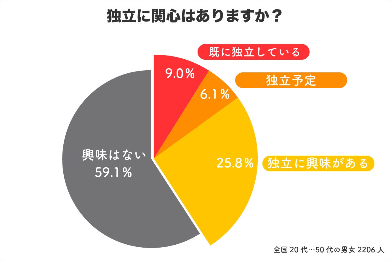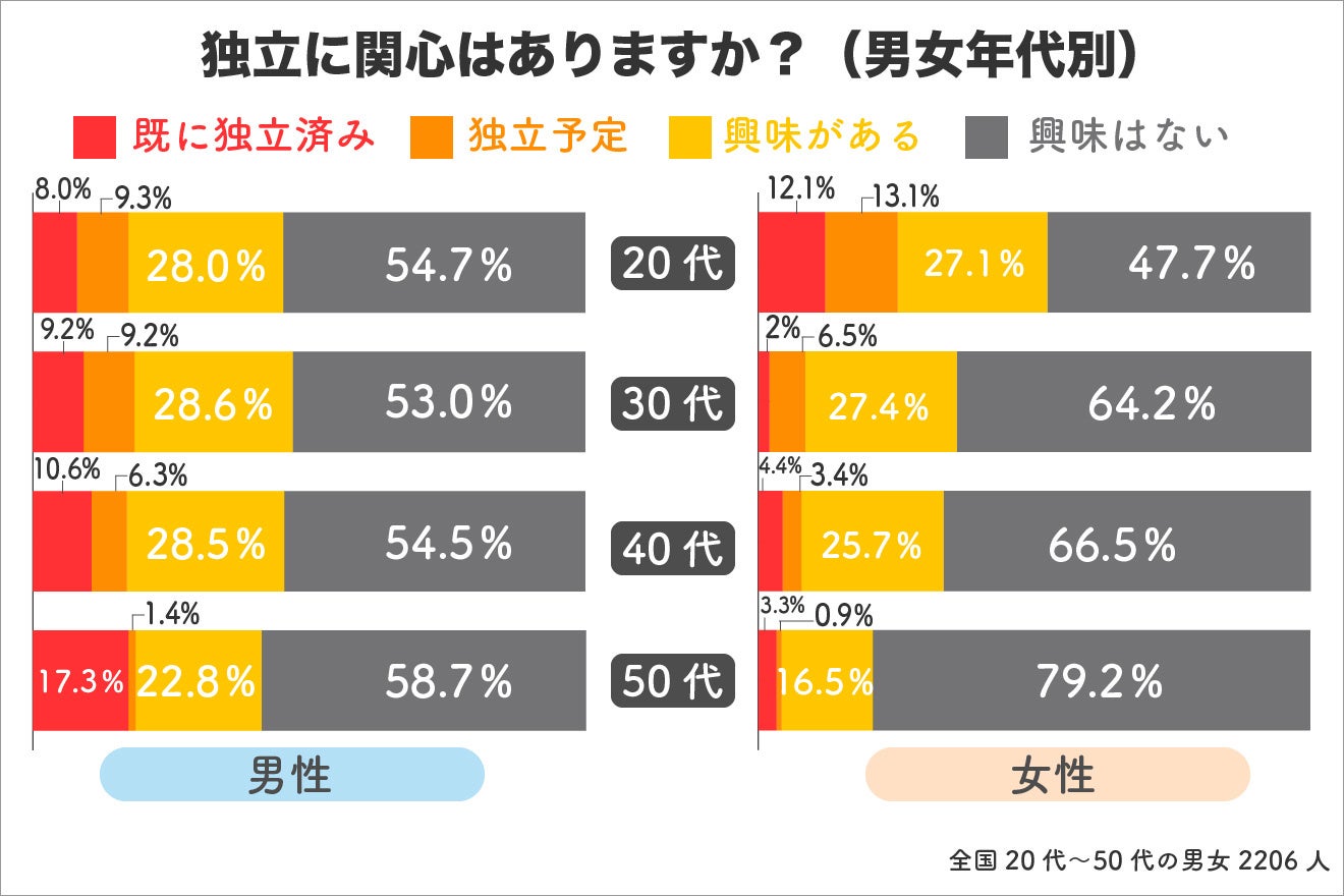 女性については、男性と異なり年代が高くなるにつれて、「独立に関心がある」という回答割合が減少傾向にあり、「既に独立済み」という回答も少なくなっていることがわかりました。一方で、20代においては男性よりも女性の方が、僅かながら独立への関心が強いこともわかりました。