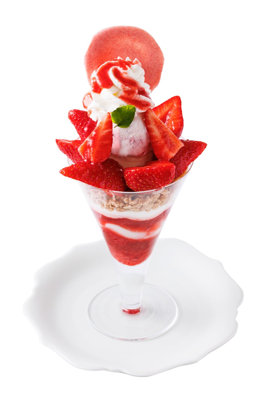 もうひとつの新商品は、時季のストロベリーを贅沢に使った「いちごパフェ」。目を引く可愛らしい見た目だけで無く、いちごの甘酸っぱさを引き立てる果肉感のあるピュレと、リッチな味わいのクレームシャンティのハーモニーは、夏の暑さを吹き飛ばすおいしさです。