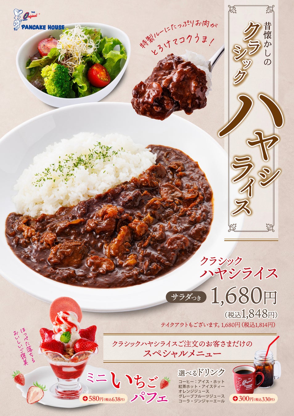 「見て幸せ。食べてもっと幸せ。」 オリジナルパンケーキハウスの新しいスペシャルメニューは、手づくりの熟成ルーが決め手の「クラシックハヤシライス」。シェフが長年培った特別なレシピで仕立てるハヤシライスは、豊かな風味に深いコクとうま味。ひと口召し上がると後をひくおいしさです。