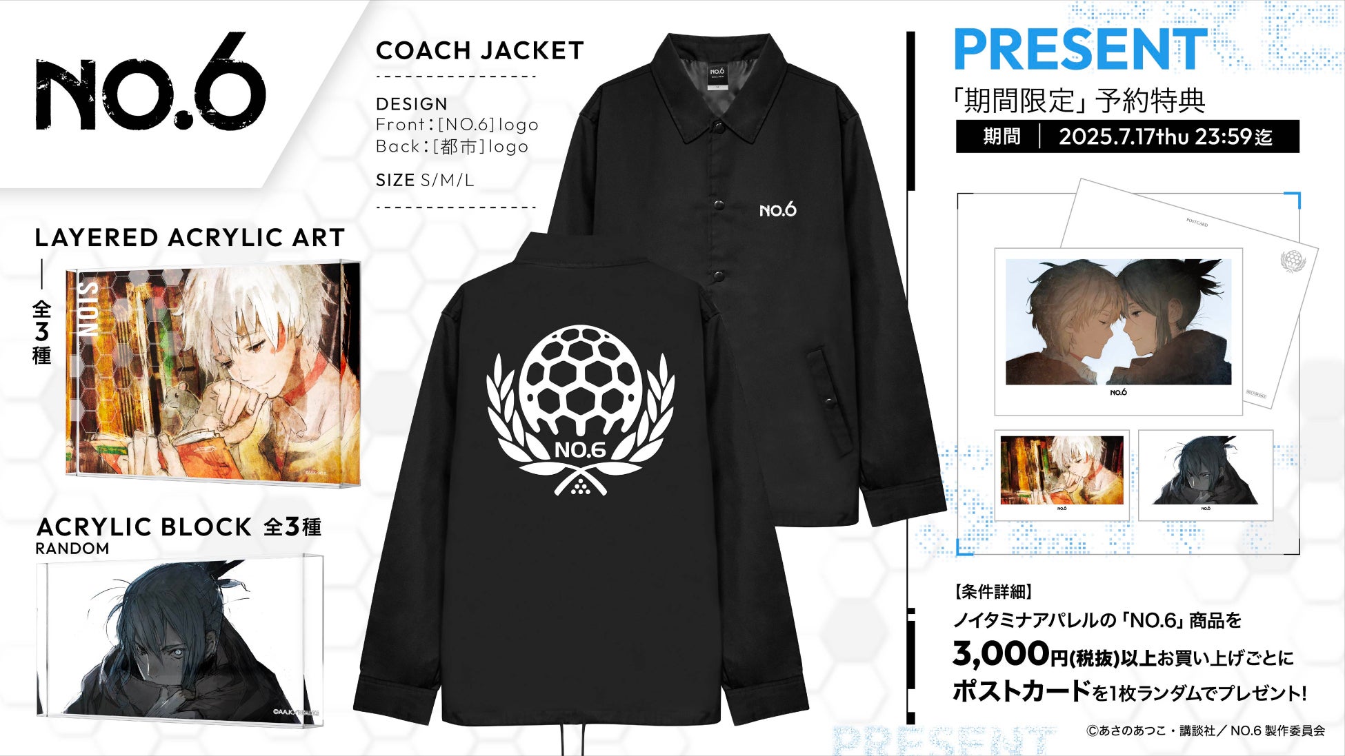 TVアニメ「NO.6」より、アニメ放送当時のエンドカードに使用されていたtoi8先生が描く繊細なイラストが美しいアクリルグッズ他、コーチジャケットが新登場!