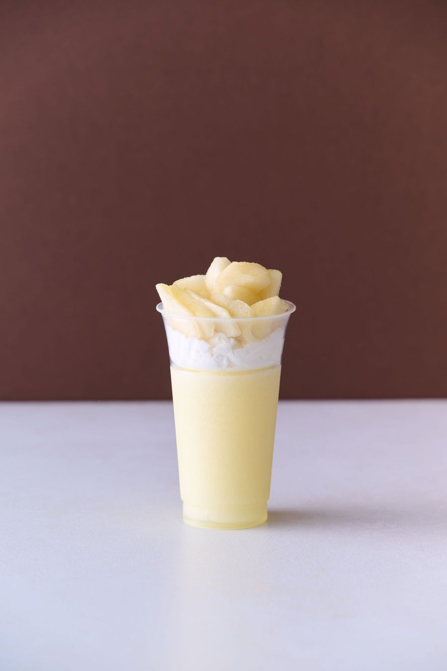 フルーツのおいしさを引き立てるやさしいホイップクリームと甘酸っぱい洋梨が相性抜群です。おいしさを存分にお楽しみいただけるよう、カップはあえて上段の層と下段の層で分けてあり、洋梨を食べて、飲んで楽しめ、クリームやジュースと混ぜても楽しめる商品です。