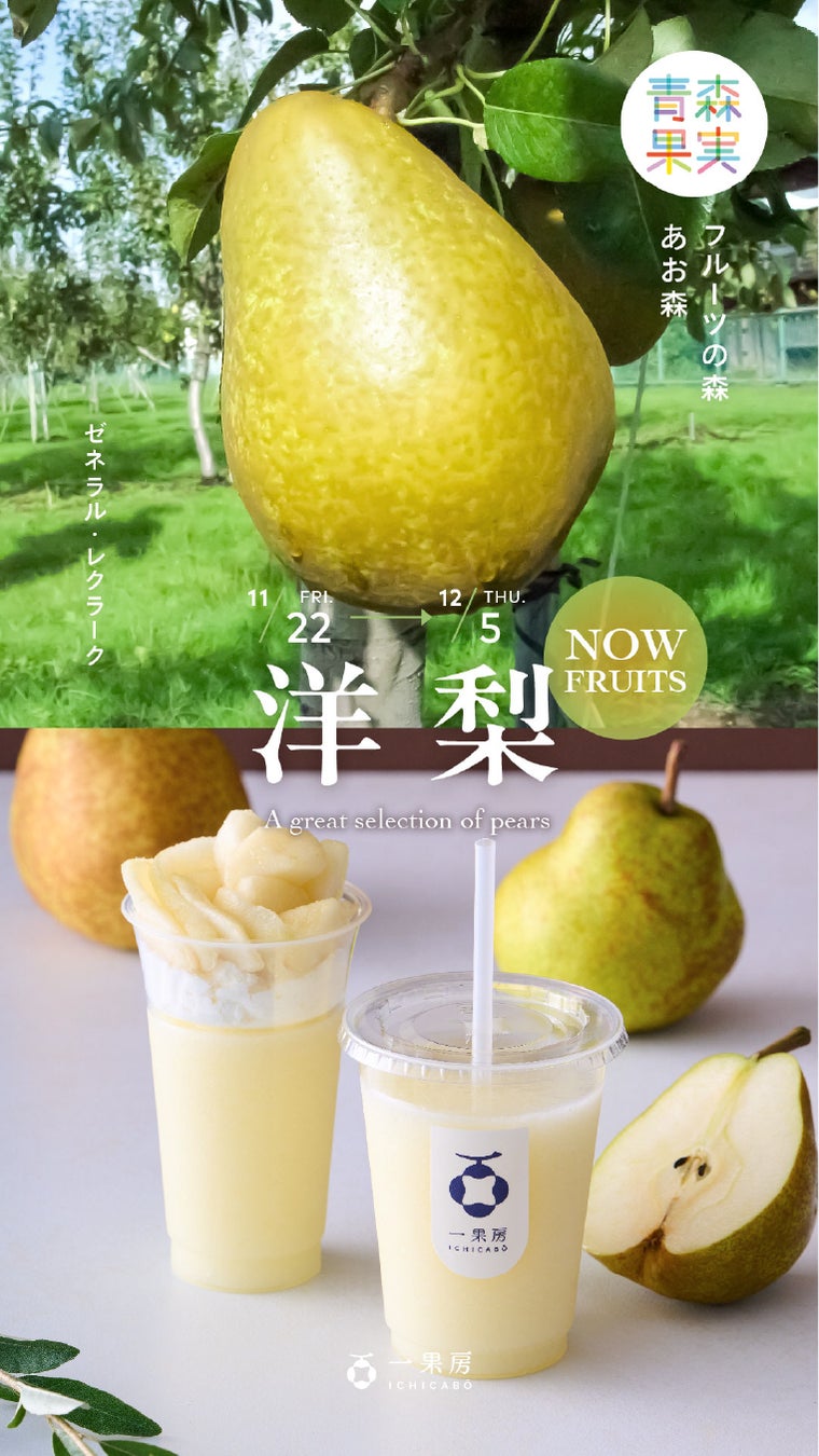 今回、コラボ第二弾として、創業100周年を迎えたフルーツ専門店、株式会社青木商店が東京都内で運営する店舗「一果房」及びフルーツジュースバー&デリ「FRUITS IN LIFE」において、青森県が収穫量全国ナンバー1を誇る、今が旬の西洋なし「ゼネラル・レクラーク」を使用したオリジナルメニューを、期間限定で販売します。