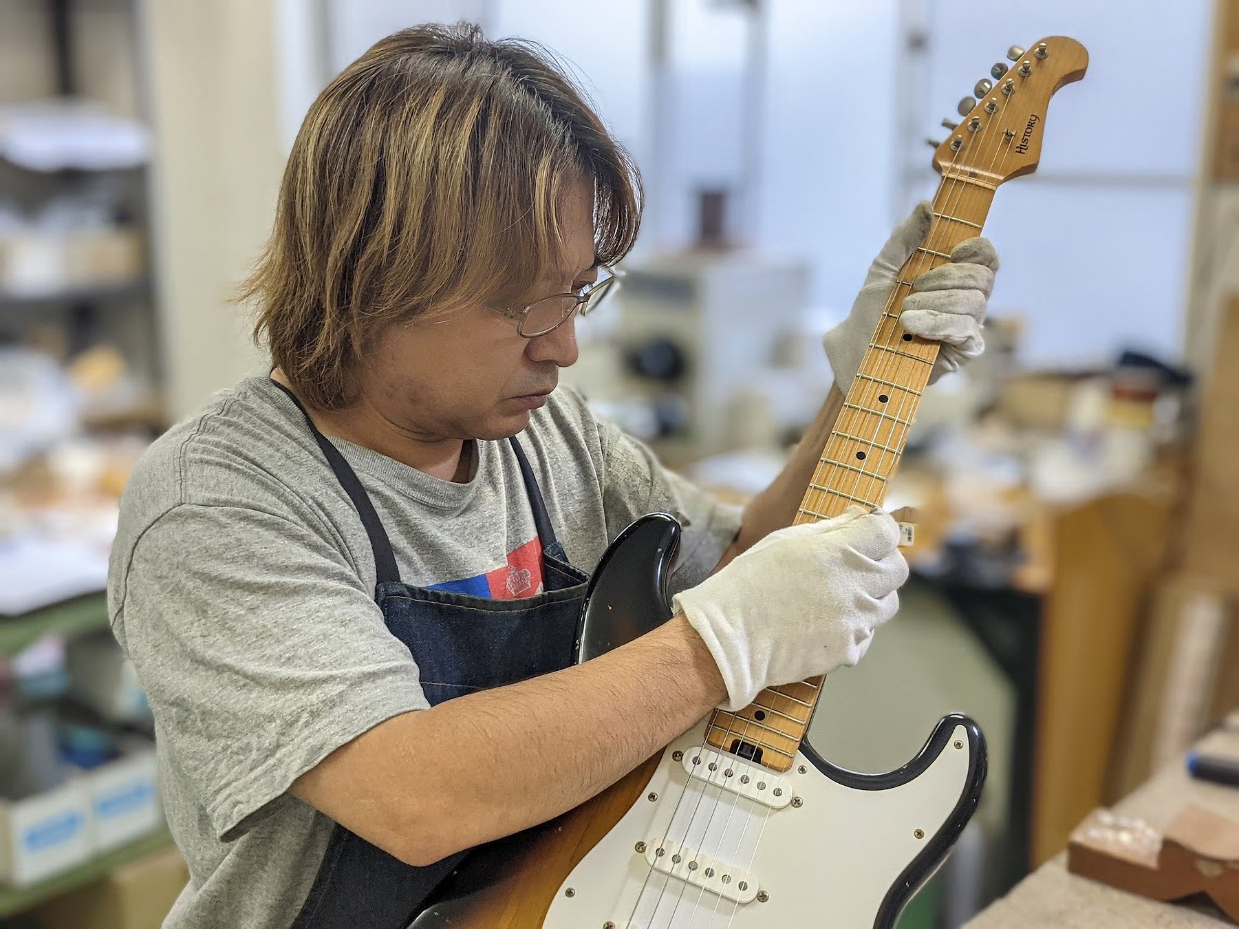 エレキギターの「HST/SSH-Premium」、ベースの「HJB-Premium」は、Tsubasa Guitar Workshop(長野県茅野市)のオーナーであり、ヴィンテージ楽器のようなサウンド・スペックを実現する技術に定評があるギター製作家、田中 千秋氏が製作を担当。伝統的なエレキギター・ベース製作の手法を重んじながらも、現代の音楽事情に寄り添ったプレイヤー目線での楽器製作は、HISTORYの目指す方向性に合致していると考え、製作を依頼しました。丹念に作られたサウンド、細部にわたるクオリティの高さに、同氏のクラフトマンシップが十二分に発揮されています。