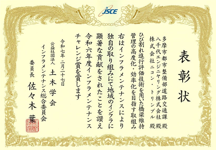 測量・測位ソリューションの開発・製造・販売を行う株式会社ニコン・トリンブル(本社:東京都大田区、代表取締役社長兼CEO:丹澤孝、以下:弊社)、八千代エンジニヤリング株式会社(本店:東京都台東区、代表取締役社長執行役員:高橋 努)、東京都多摩市(以下、多摩市)が共同で実施している「ひび割れ進⾏評価技術を⽤いた橋梁維持管理の⾼度化・効率化を⽬指す取組み」が、公益社団法人土木学会インフラメンテナンス総合委員会が主催する「2024年度インフラメンテナンス チャレンジ賞」を受賞しました。