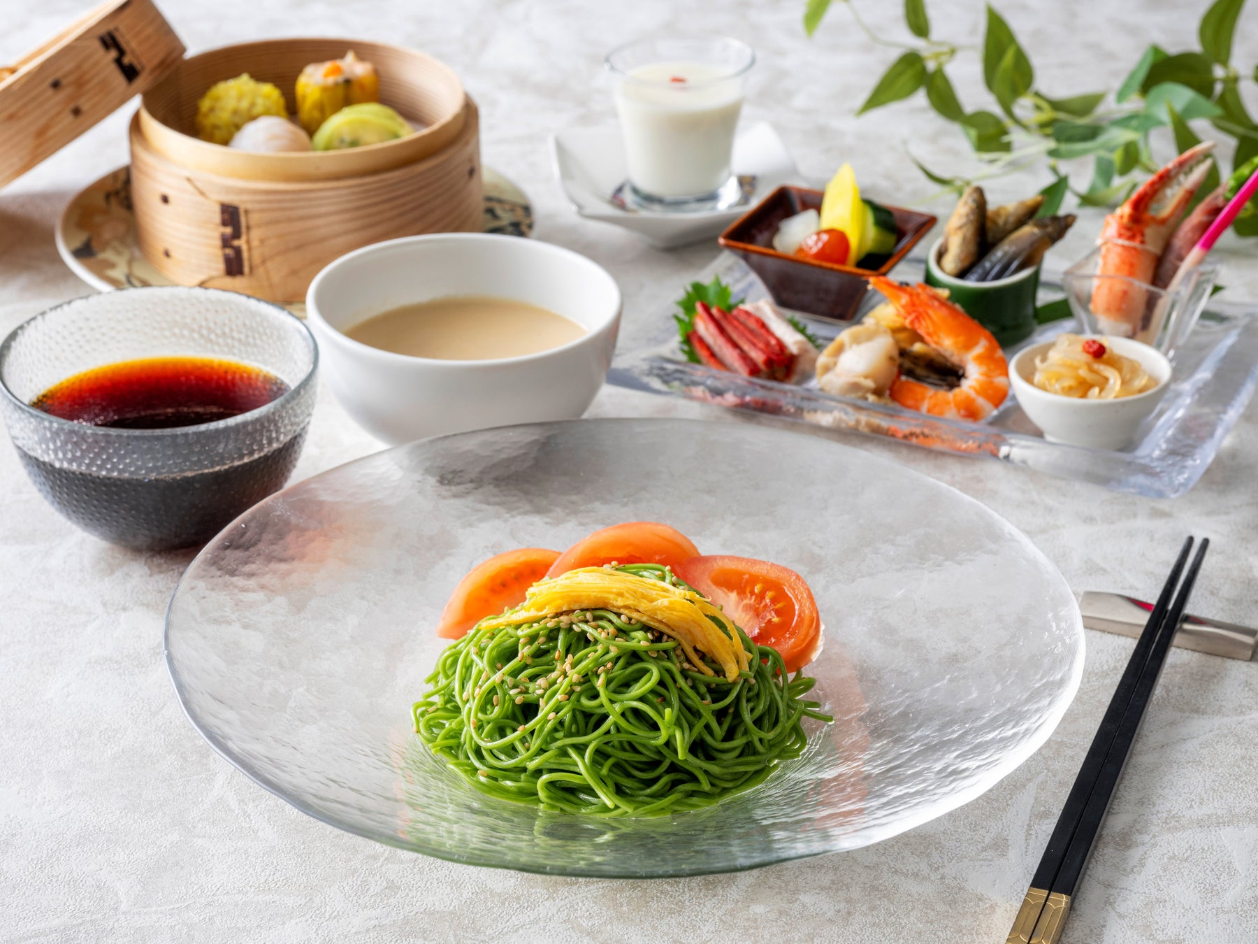この冷やし翡翠麺に、せいろで提供する蒸したての点心四種と自家製杏仁豆腐、鉄観音茶が付いた平日ランチ限定のセットメニューもご用意しております。