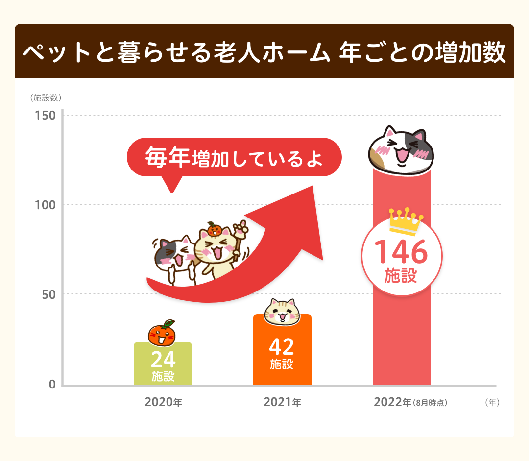 「みんなの介護」掲載施設数をみても、「ペットと暮らせる(ペット・犬・猫可)」の老人ホーム数は増加傾向にあります。2020年は+24件の増加でしたが、2021年には前年比+42件。さらに、2022年は8月現在ですでに前年比+146件の増加となっています。