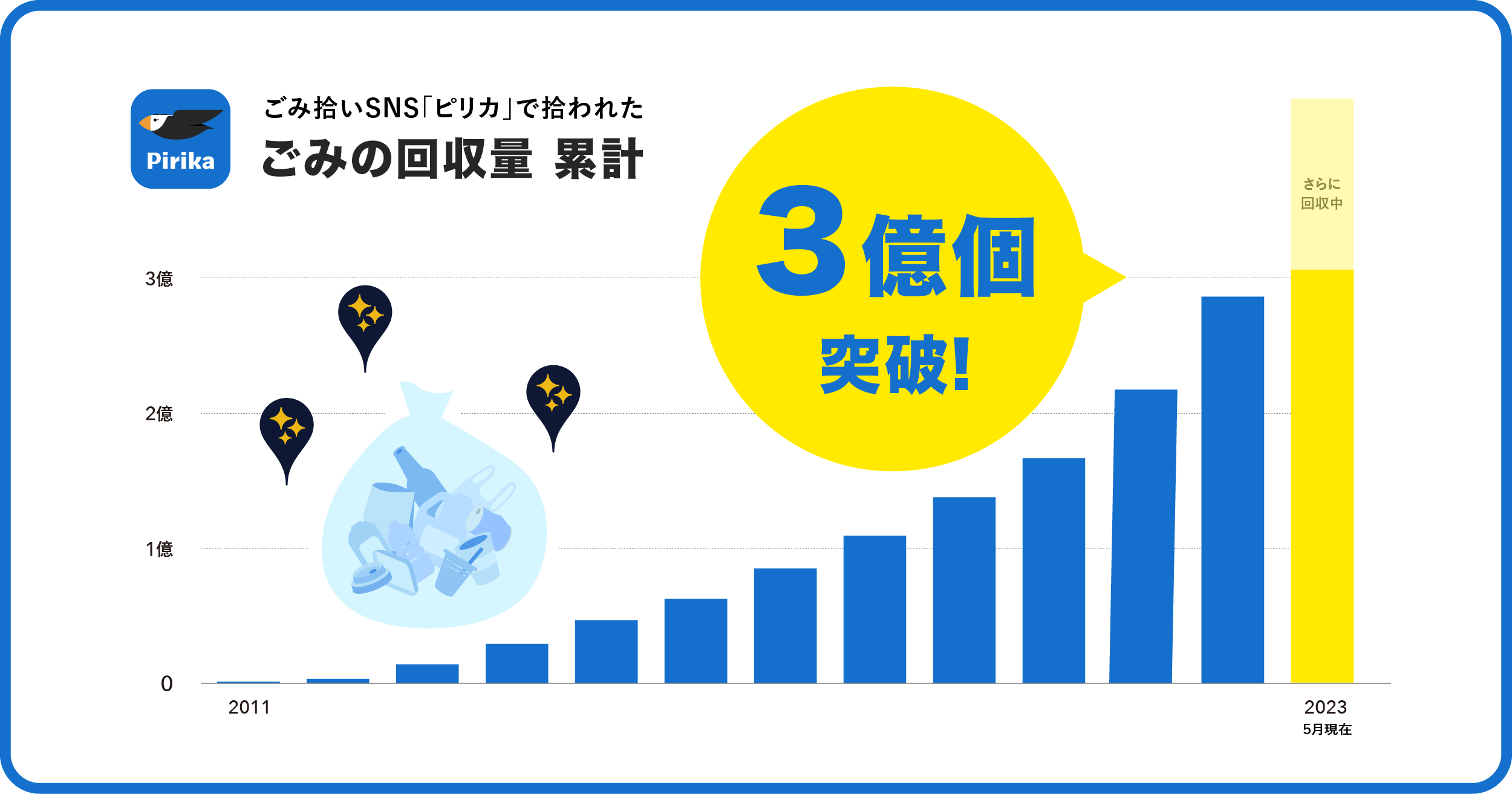 ごみ拾いSNS「ピリカ」は、2011年5月15日にリリースし、これまでに118の国と地域にて累計3億個のごみが拾われています(2023年5月30日現在)。SNSピリカ上でやりとりされるありがとう数は累計約3,000万となり、ごみ拾い活動を通じて多くのコミュニケーションが生まれています。