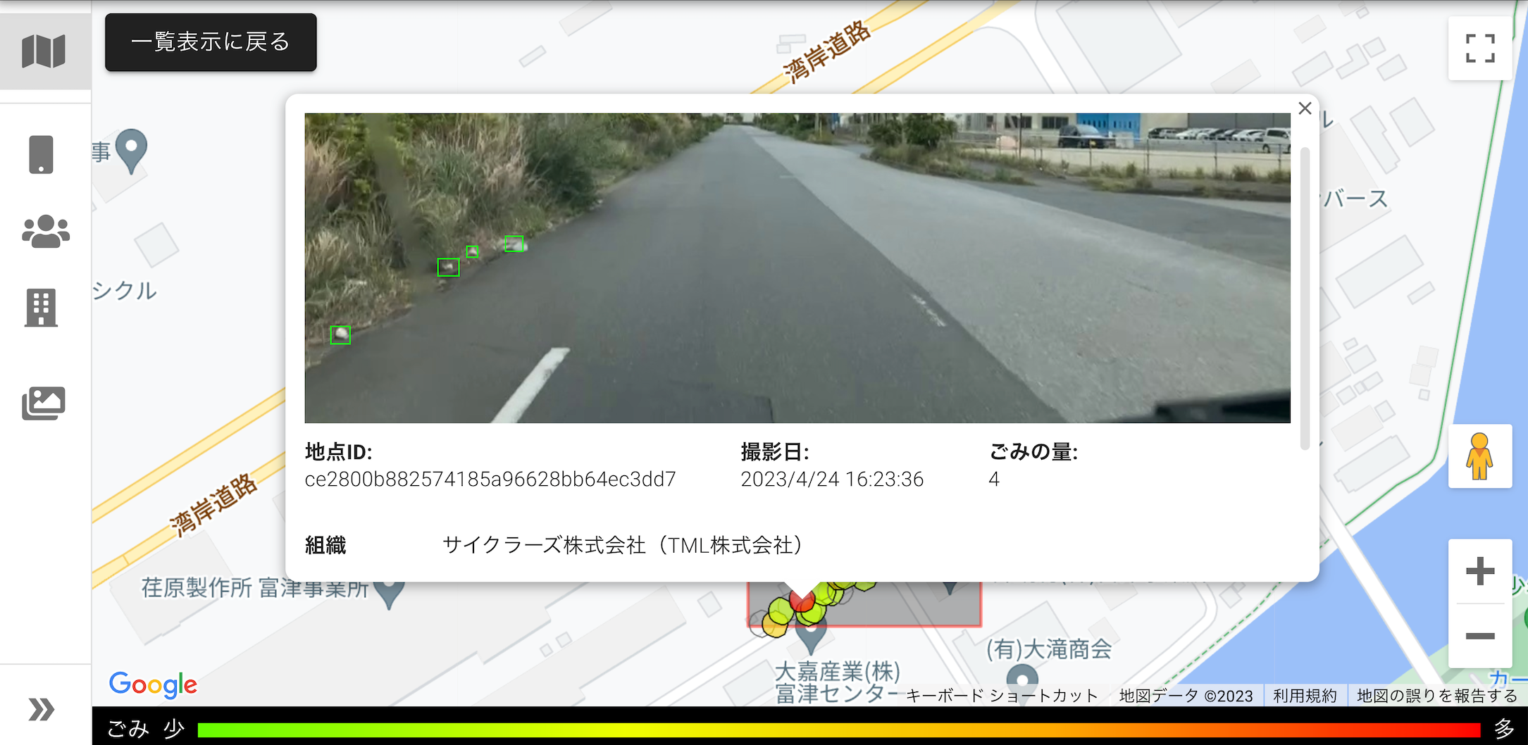 山一商事は、産業廃棄物の収集・運搬事業で街中を走行する事業用車両のドライブレコーダーの取得データをピリカに提供し、同社が運営するポイ捨てごみ分布調査サービス「タカノメ」の自動車版開発に協力するかたちで、共同で研究開発を推進してきています。