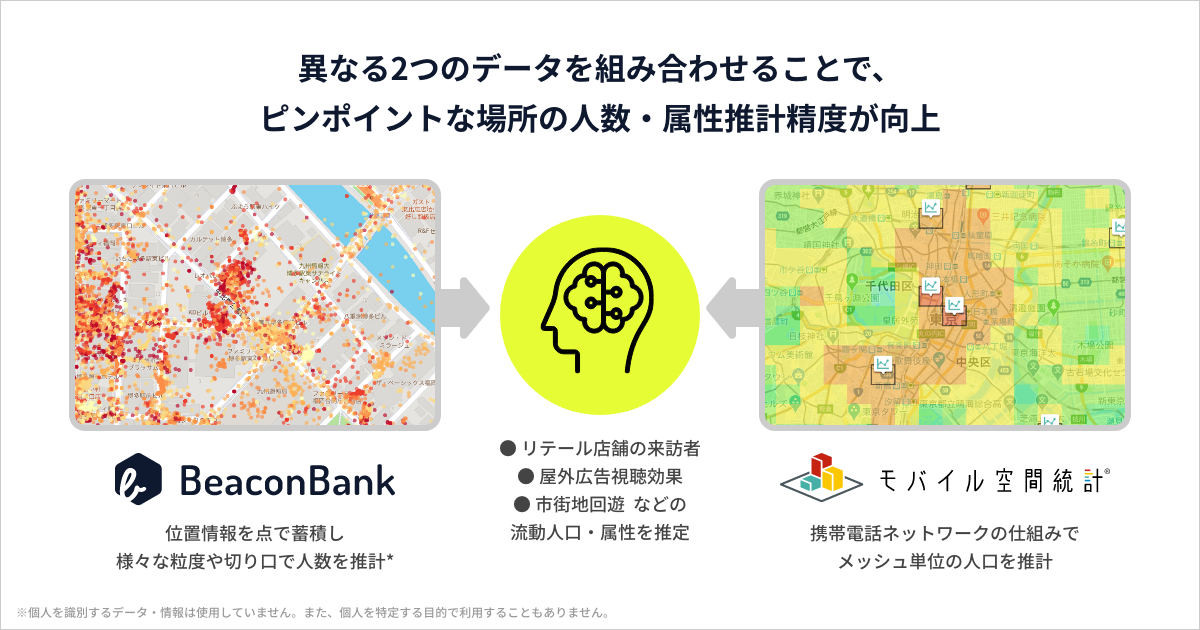 unerryの「Beacon Bank」と「モバイル空間統計(リアルタイム版)」が連携。「リテール店舗の来店人数」「屋外広告視聴」「市街地回遊」等のピンポイントスポットの人数や属性を高精度に推計。