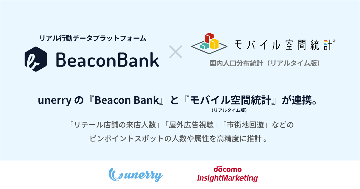 株式会社unerry(東京都港区:代表取締役CEO 内山英俊)の運営するリアル行動データプラットフォーム「Beacon Bank®️」(以下、Beacon Bank)は、株式会社ドコモ・インサイトマーケティング(本社:東京都豊島区、代表取締役社長:三毛孝彦)の提供する「モバイル空間統計®️人口分布統計(リアルタイム版)」(以下、モバイル空間統計)とのプロダクト連携を開始しました。