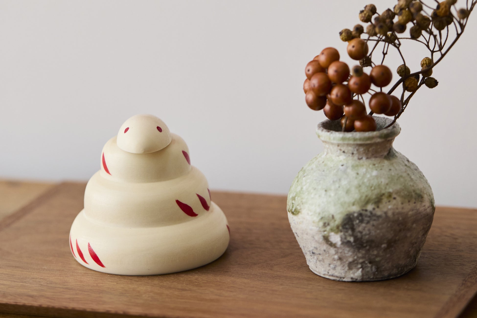 伝統的なこけしの技術を用いて作った干支のこけし。複数のパーツを組み合わせることで、とぐろを巻いたヘビのフォルムを表現。職人技によるシンプルな線と形、色使いが特徴です。