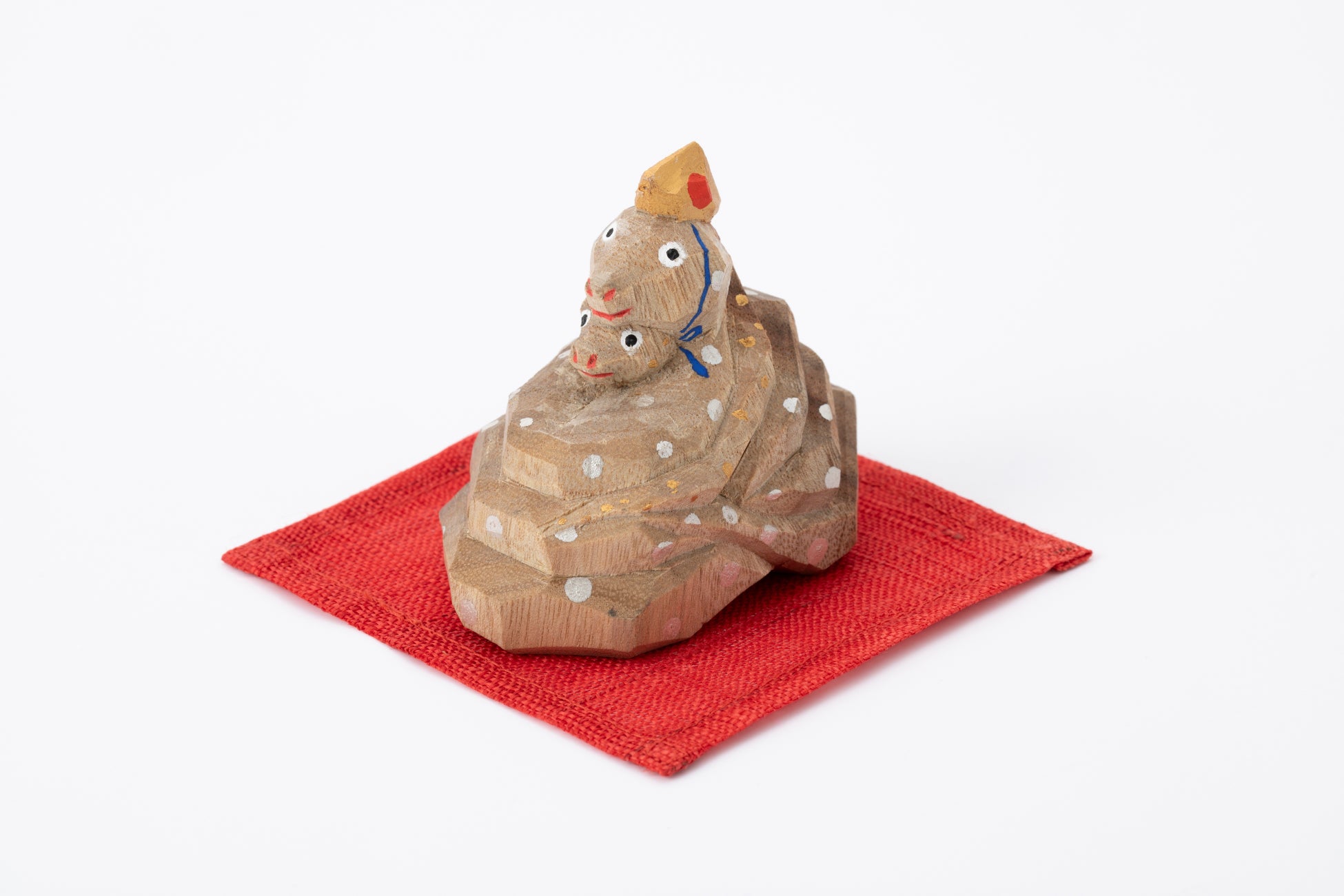 奈良県の一刀彫作家、土井志清氏が手掛けた干支飾り。仲睦まじく寄り添う親子の姿を表現しています。一年の家族の幸せを願ってお飾りください。
