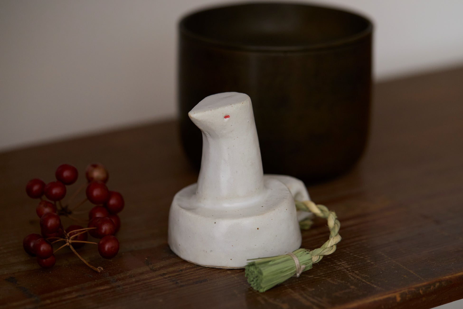 愛知県瀬戸市の「中外陶園」と作った干支飾り。白く美しい陶土が特徴の瀬戸焼に、青みのある古染釉を用いて、上品な質感に仕上げました。