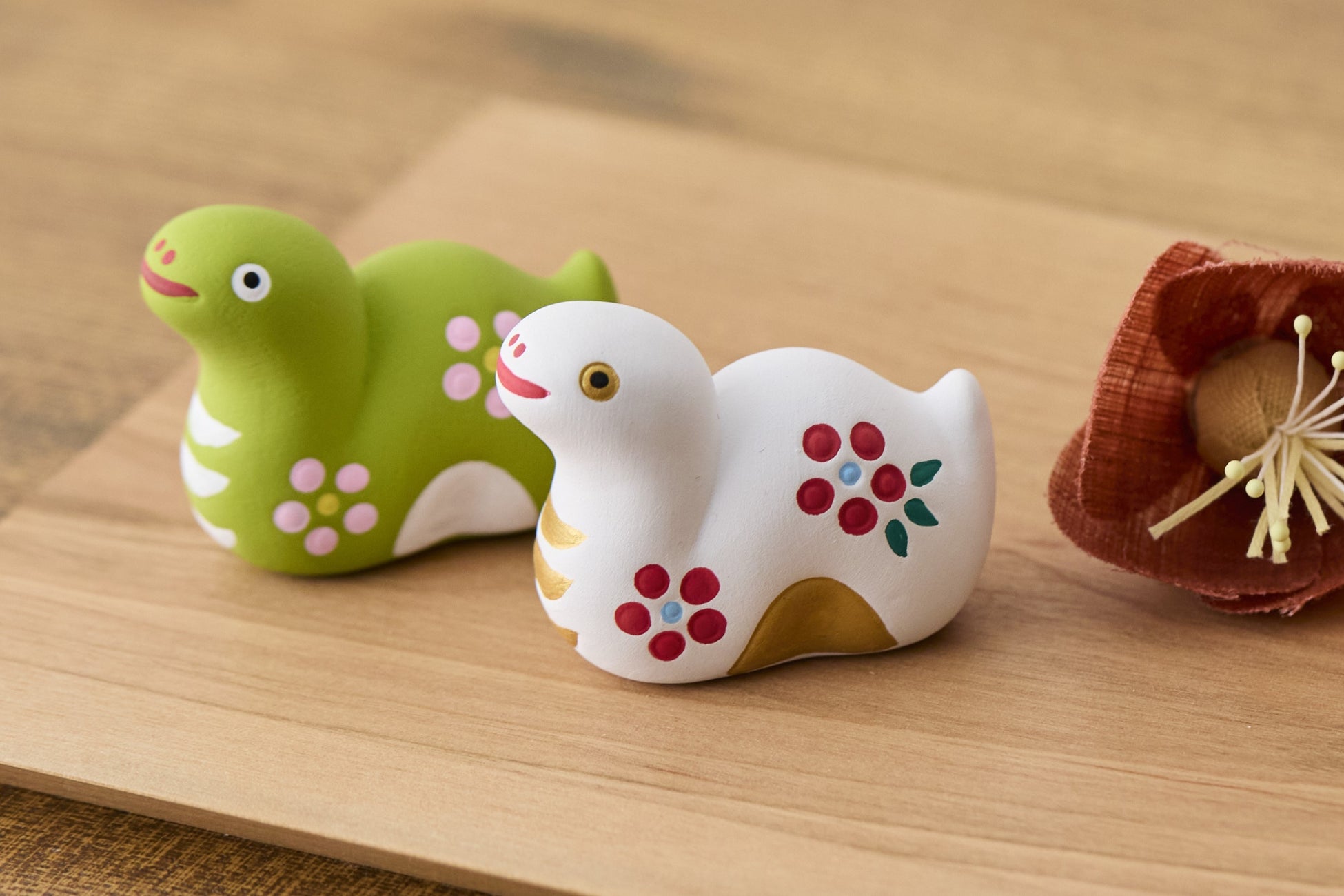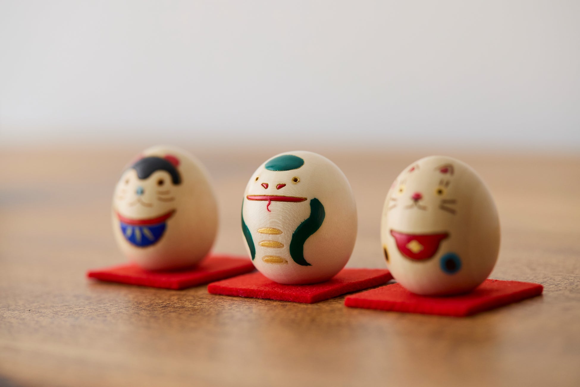 郷土玩具や創作玩具を制作する「野沢民芸」と作った干支の張子。頭に触れると前後左右に首を動かします。職人技によって一つひとつ筆で施された彩色が、心あたたまる味わいを生み出しています。