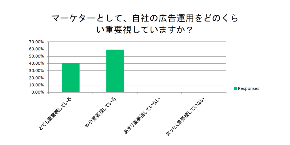 また、同調査において「マーケターとして、自社の広告運用をどのくらい重要視していますか?」という問いに対して、「とても重要視している」が40.79%、「やや重要視している」が59.21%との回答結果が得られ、マーケターにとって広告運用は最重要課題の一つになっていると考えられます。