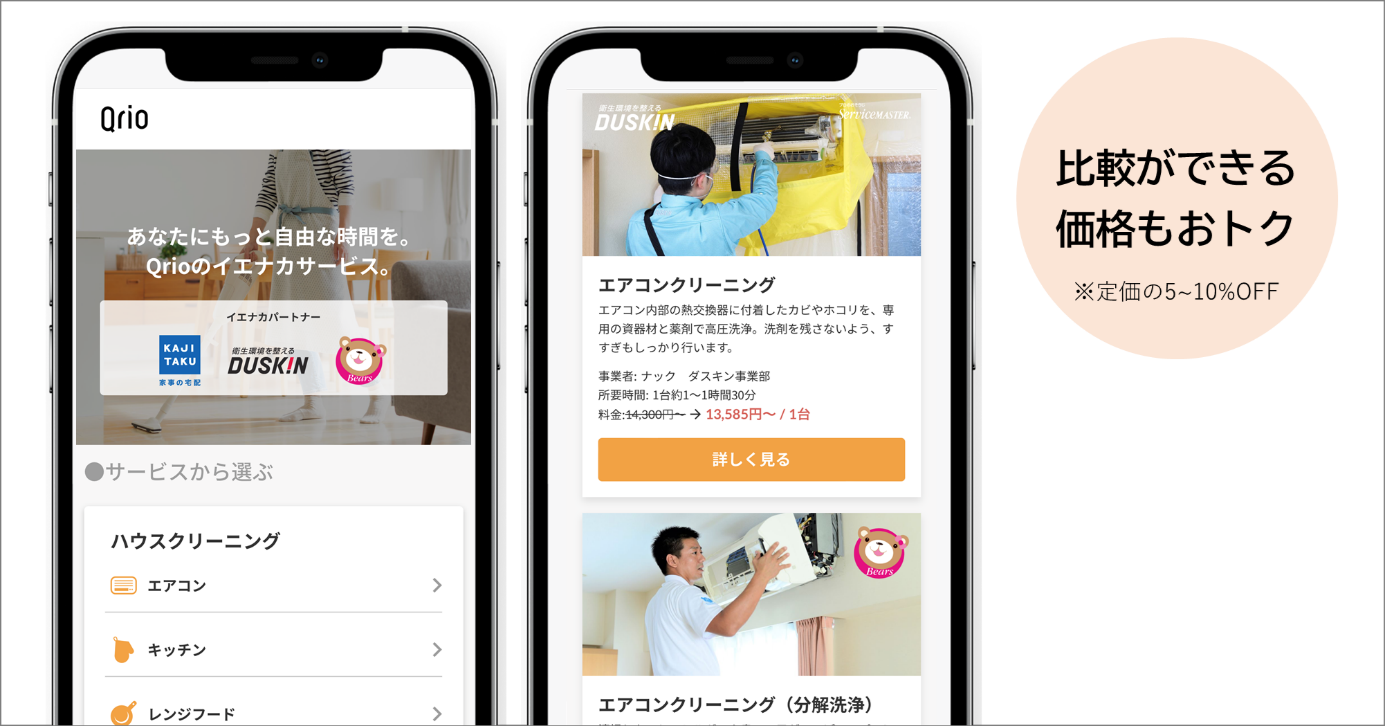 今回の取り組みでは、「Qrio Lock」アプリ内から、カジタクに加え、ベアーズ、ナックが提供するハウスクリーニングや家事代行への申込みが可能となり、より自分に合ったサービスを、お得に利用ができる利便性の高いサービスとなりました。