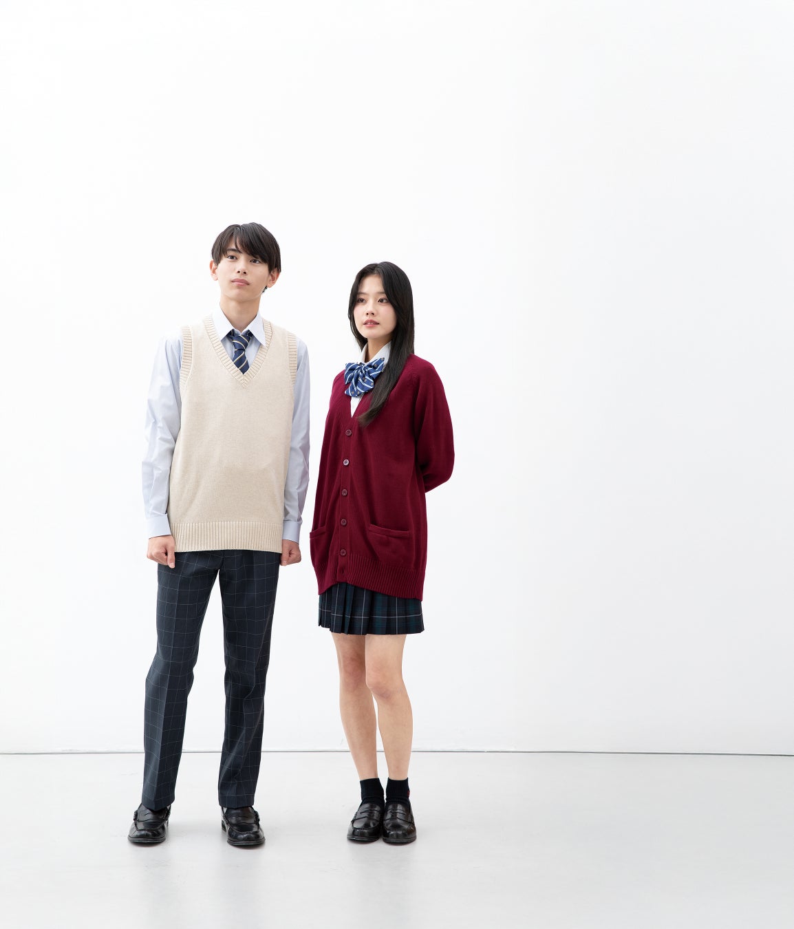 ユニセックスタイプのカーディガンに、新しくエンジ色が登場。落ち着いた深みのある色合いで、大人っぽい上品な印象を与えます。グレーブレザーとの相性は抜群。