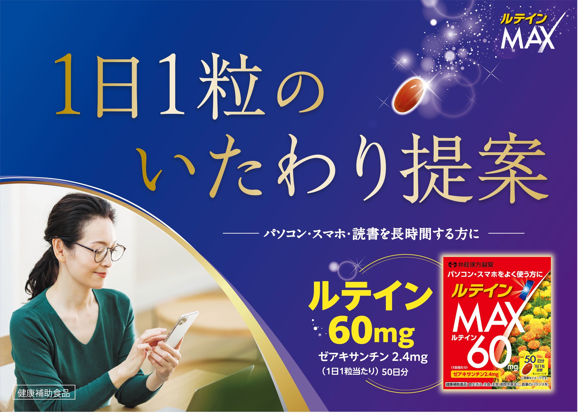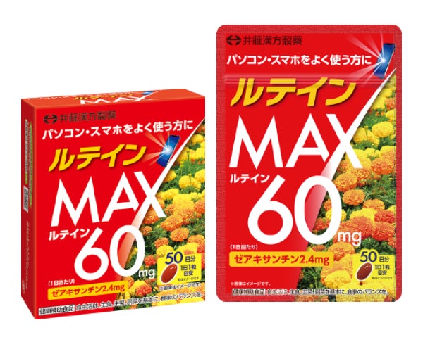 ブルーベリーがメイン素材、ルテインが副素材という商品が市場では多かったのですが、最近では、ルテインの知名度も向上してきました。そこでこの度、注目が高まっている「ルテイン」を井藤史上最大量の1粒60mg配合した「ルテインMAX」を開発いたしました。