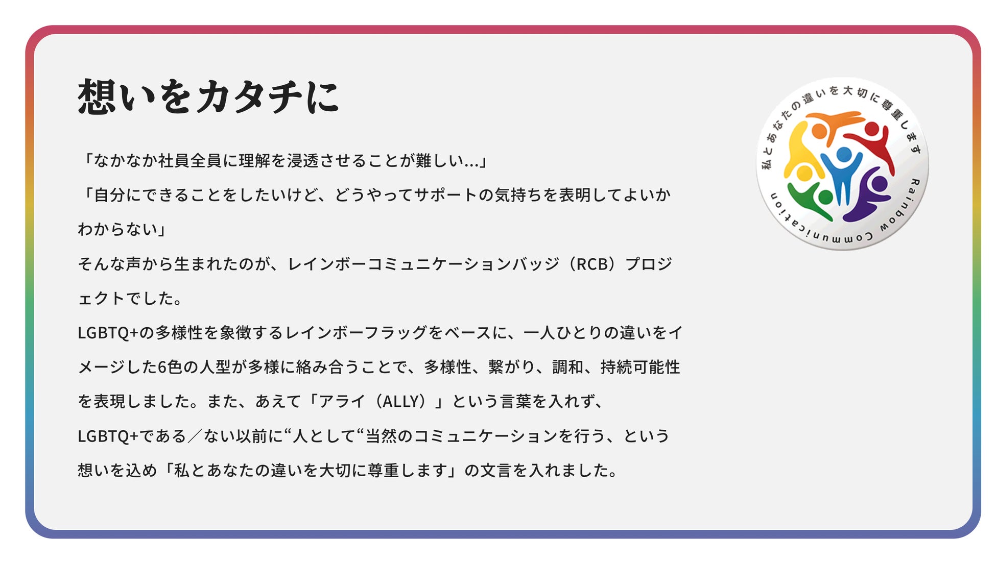 そんな声から生まれたのが、レインボーコミュニケーションバッジ(RCB)プロジェクトでした。