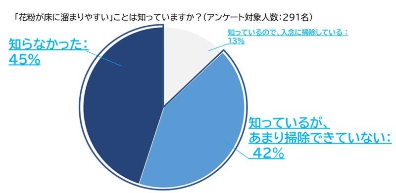 また「花粉が床に溜まりやすいことを知っているか」の設問に対しては、「知っているが、あまり掃除できていない」「知らなかった」という回答が約9割に。花粉は粒子が小さく見逃されてしまうことや、掃除機で飛散してしまうこともあるため、床についた花粉の対策には、水拭きが最も効果的です。また、花粉やホコリは外から常に入ってくるため、こまめに水拭きを行う必要があります。