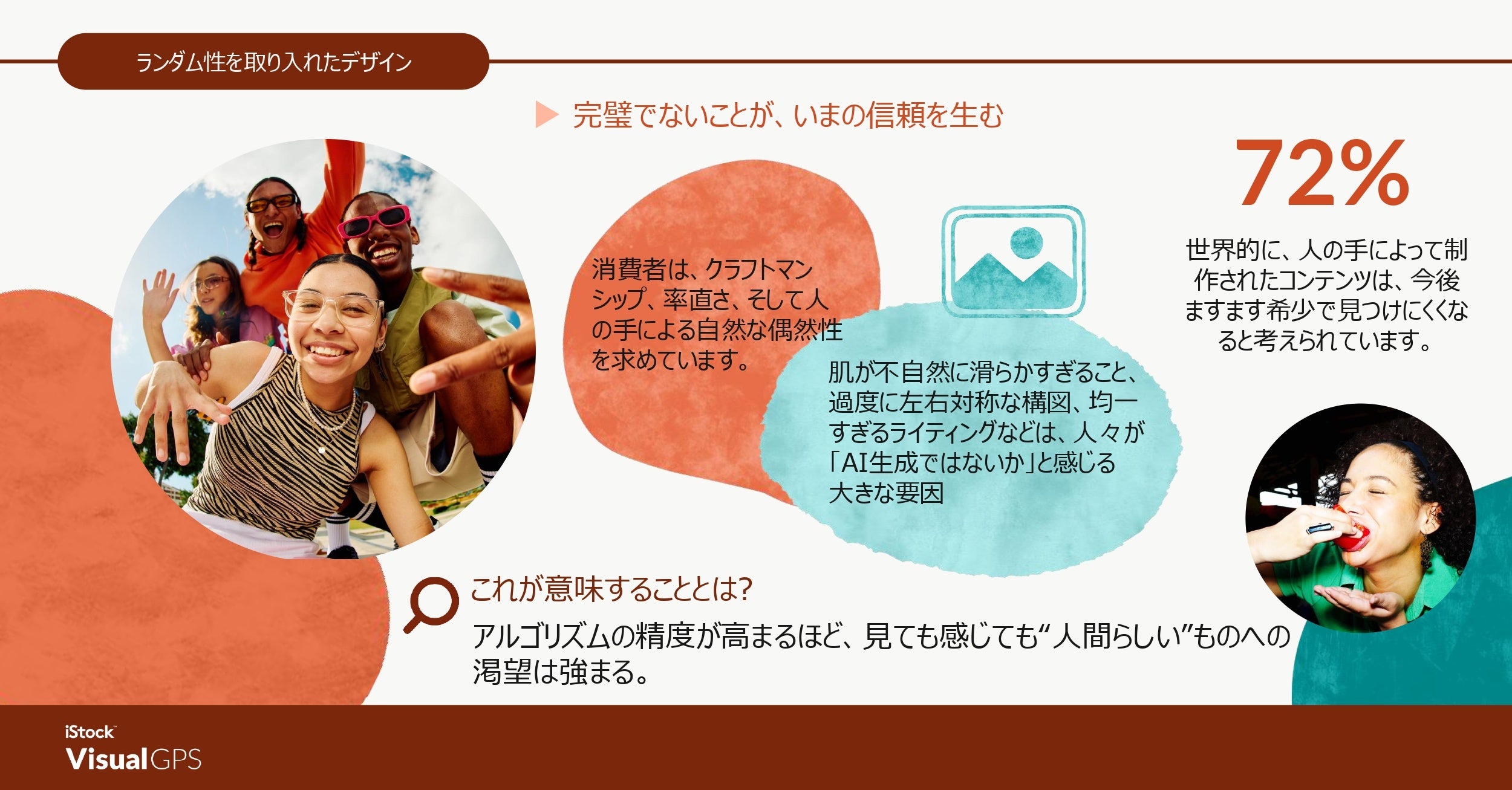 ランダム性こそが、実店舗でのショッピングや偶然の発見、そしてビジュアルやブランドストーリーテリングにおいて「新しいものに出会った」と感じる体験を生み出す原動力です。VisualGPSによると、肌が不自然に滑らかすぎること、過度に左右対称な構図、均一すぎるライティングなどは、人々が「AI 生成ではないか」と感じる大きな要因となります。一度「生成された」と感じられると、信頼は急速に失われてしまいます。その反動として、素材感、テクスチャー、素朴でナイーブな表現など、「人の手を感じさせるビジュアル」への関心が高まっています。中小企業にとっては、完璧さよりもプロセスを見せること、演出よりも率直さを優先することが重要です。人工的で磨き上げられた世界だからこそ、“偶然の美しさ”こそが真正性の証となり、今まさに消費者が求めている要素なのです。