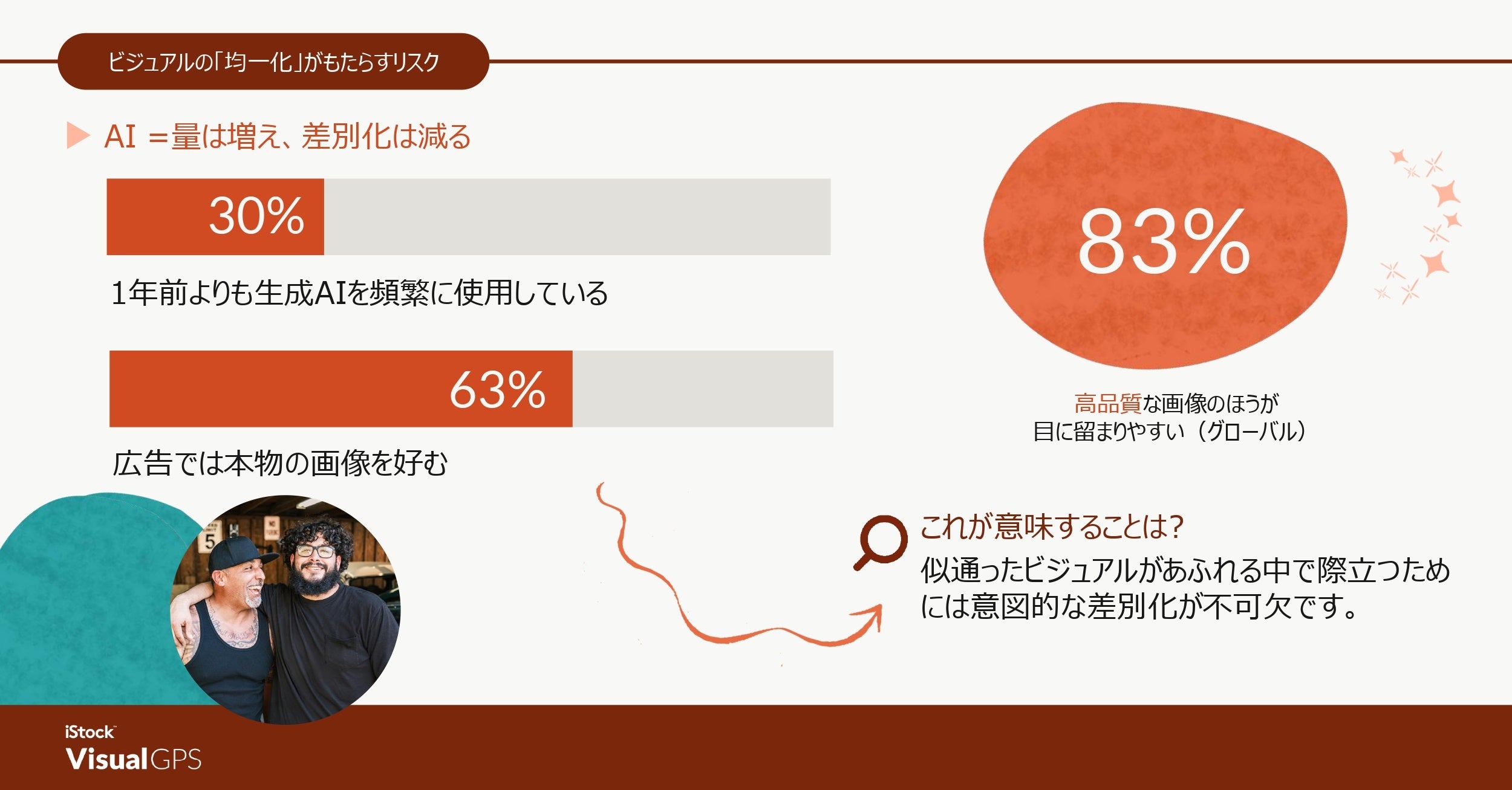 生成AIツールが、プレゼン資料、メール、ウェブサイト、ピッチデック、SNS投稿など、日常的なマーケティング活動に浸透する中で、ブランドが生み出すビジュアルの量は急増しています。VisualGPSによると、世界全体の44%、また日本の消費者の30%が「1年前よりも生成AIを頻繁に使用している」と回答しており、その理由に「簡単に、洗練されたコンテンツを素早く作れる」ことを挙げています。しかしその反面、多くのコンテンツが似通った見た目・印象になってしまっています。VisualGPSの画像テストでは、世界全体の83%が「高品質な画像のほうが目に留まりやすい」と回答しており、AI生成かどうかに関わらず、明瞭さやリアリティ、クラフトマンシップの重要性が浮き彫りになっています。中小企業にとっての鍵は、AIの賢い活用と真正性の両立です。AIはトーンや色、構図の調整に役立つ一方で、リアルな画像は信頼性を補完します。実際、日本の消費者の63%が「広告では本物の画像を好む」と回答しています。