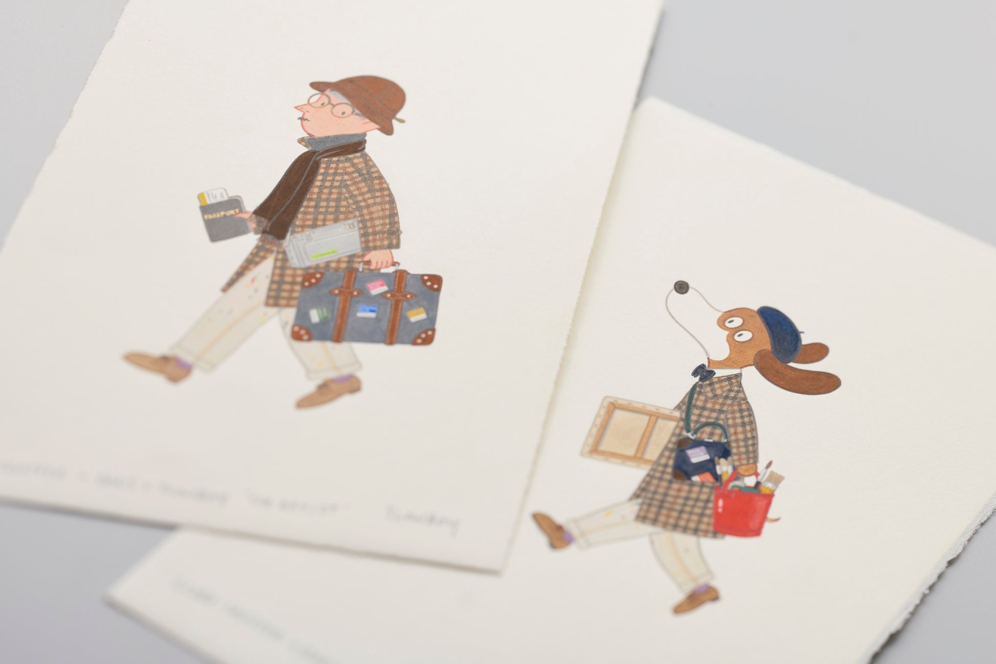 トリプルコラボレーションしたスーツケースにプリントされている、Mr. Slowboyが自身を描いたイラスト『The Artist』と、その仲間であり、「ダックス」の愛すべきマスコットであるダックスフンドの「マックス」を描いたイラスト『The Little Artist』の貴重な原画作品を出品いたします。(各1点、計2点)