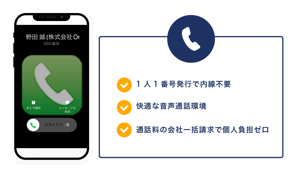 ユーザーごとに050番号が発行できるため、外部との電話連絡は、どこにいてもスマホ1台で完結できます。電話番のために出社する必要もありません。