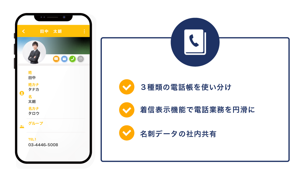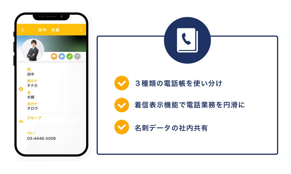 クラウド電話帳では、[社内電話帳/共有電話帳/個人電話帳]の3種類の電話帳に分類して連絡先を共有管理することができます。