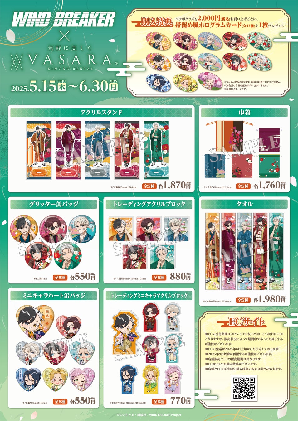 『着物レンタルVASARA』を全国に展開する株式会社バサラホールディングス(本社:東京都千代田区、代表取締役社長:鈴木雄一郎、以下VASARA)は、2025年5月15日(木)~6月30日(月)の期間、現在TVアニメSeason 2が放送中の超話題作TVアニメ『WIND BREAKER』と、コラボレーションキャンペーン『これより先 着物をまとう者 美を楽しむ者 好きを持ち込む者 何人も例外なく ボウフウリンが歓迎する!!』を開催いたします。同作品において、着物レンタル企業とのコラボレーションは初となります。