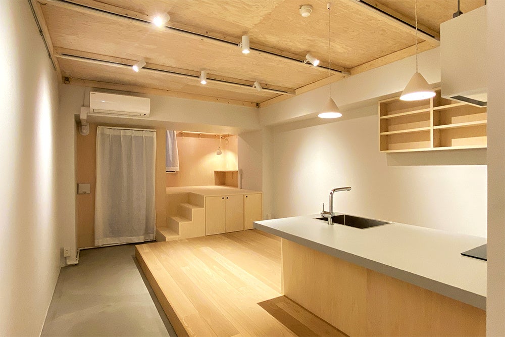 2020年にウッド×モルタルのスマートな山小屋をイメージさせるCABINシリーズをYURIEさんとリリースいたしました。前回のCABINシリーズにあたっては、「ワンルームでも広いお部屋であり、やりたいことがやれた。次は狭いということをネガティブではなく、コンパクトだからこそ、”ワクワクする””居心地の良い住処”のようにポジティブなものにしたい」とYURIEさんの想いから、新シリーズは遊び心もありながら、ロフトが作る高低差と、上下左右に広がるギミックに溢れた空間へとアップデートされたシリーズとなりました。
