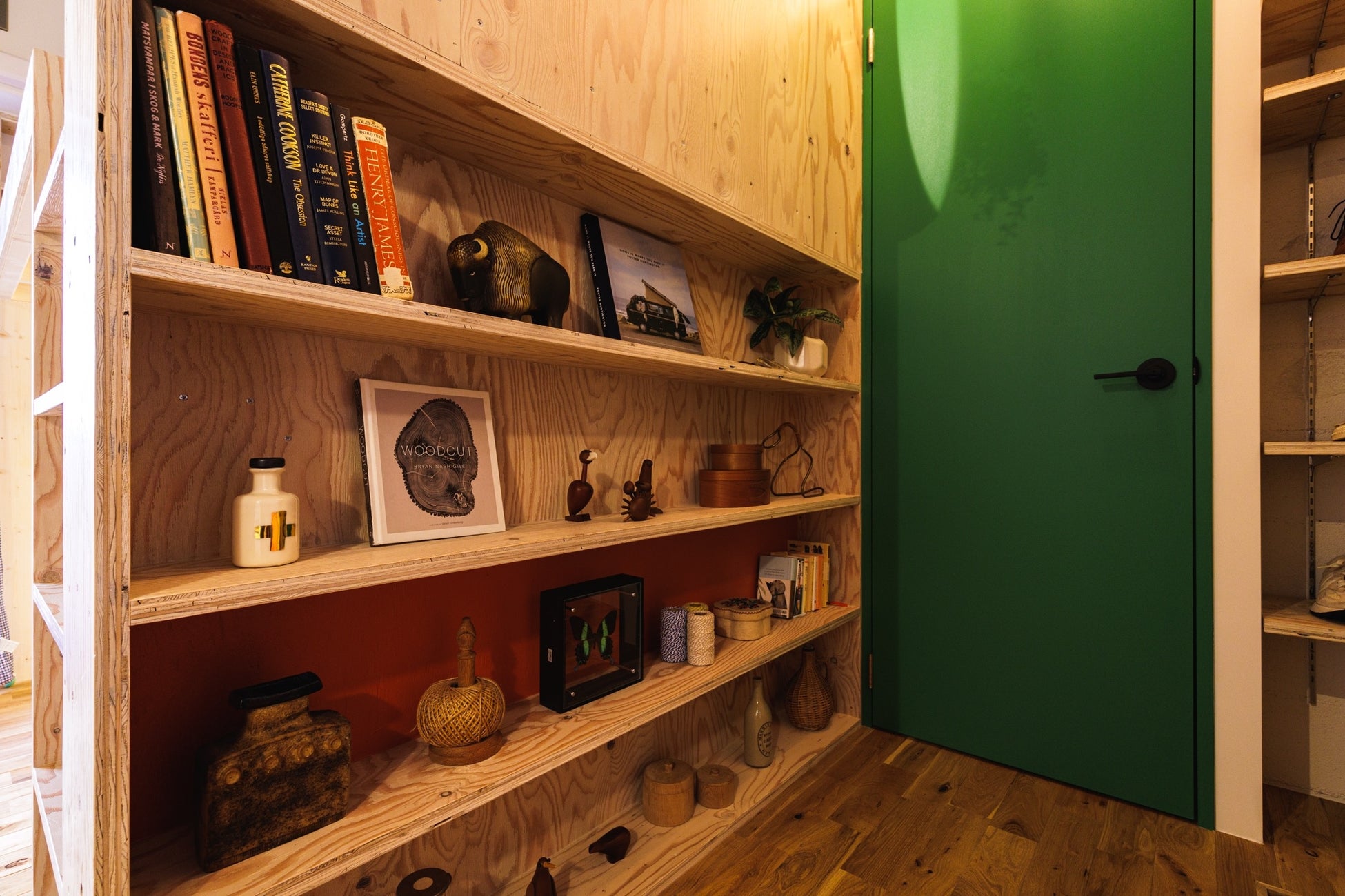 玄関を入り正面の飾り棚の一部には、温かみのあるオレンジのアクセントカラーをオン。洗練されたグリーンの扉との相性が良く、暮らす人の気持ちと空間を明るく包み込んでくれます。