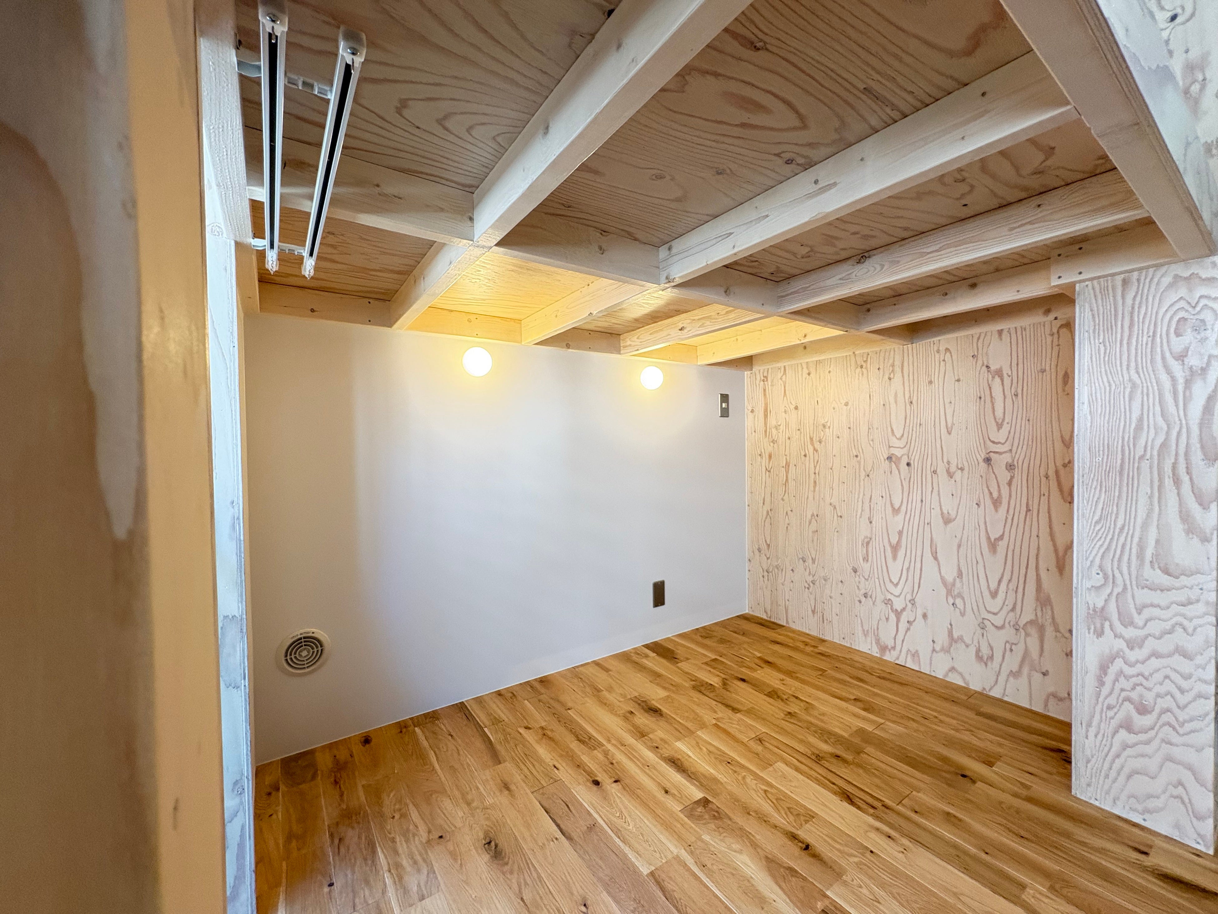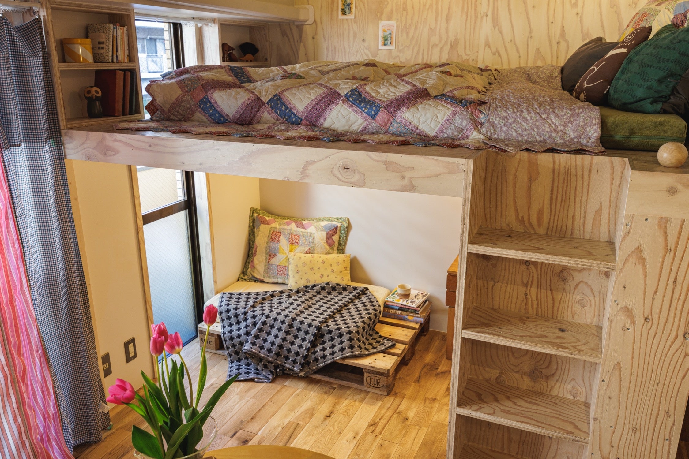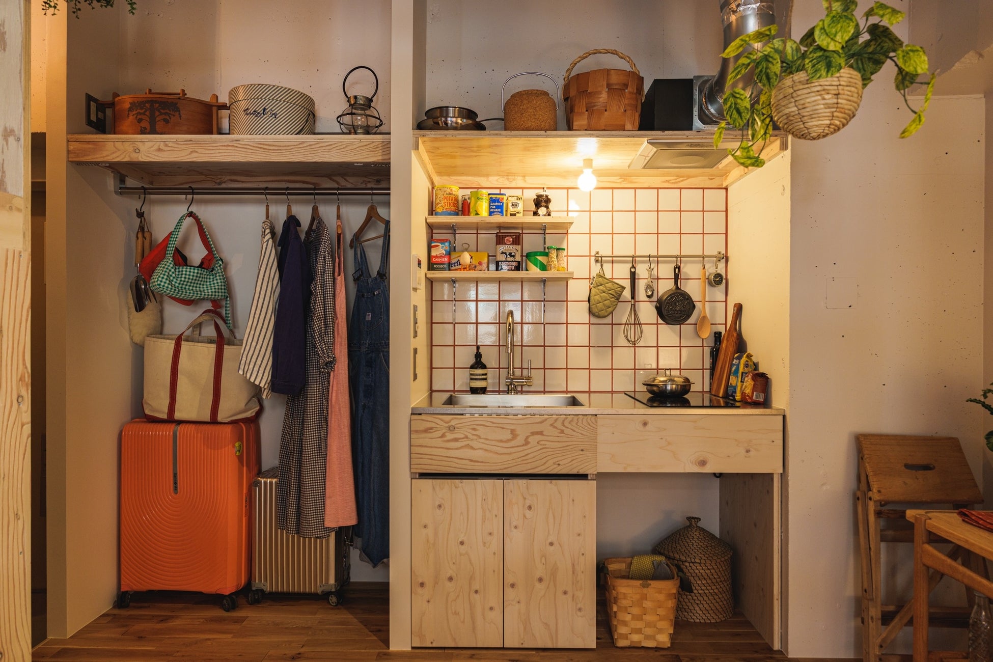 ロフト空間へはハシゴではなく収納棚に見える階段を造作。遊び心のある作りにし、同素材で統一感を演出しました。キッチンには拡張作業台がついており、必要なときに広げられるようになっています。天井にはネット収納を取り付け、空間全体が収納スペースとして使えるように。今回の裏テーマ「スペースマスター」の通り、限られた空間を最大限に活かせるお部屋となりました。