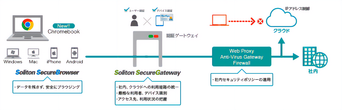 そして、今回、ChromeOS 上での利用を正式サポートした Soliton SecureBrowserは、端末内の隔離領域で動作するブラウザ製品です。認証ゲートウェイと連携して動作し、Webサービスへのアクセス経路の制御やリモートアクセスを可能にします。