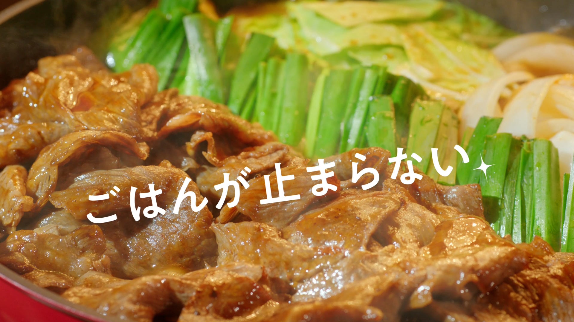 新CM『フライパンのワンマンショー』篇は、コック帽姿でフライパンを手にした瀬戸さんがステージに見立てたキッチンに登場する、まるでショーのようなシーンからスタートします。「肉を焼いて、たれを絡めて、野菜と煮込むだけ」という、焼肉鍋の調理がフライパンひとつで簡単にできることを説明し、ワンマンショーのクライマックスでは「フライパンのまま」食卓へ並べ、調理から配膳までがより手軽であることをアピールします。「鍋なのか?焼肉なのか?」と瀬戸さんが画面越しに問いかけてきます。ごはんが止まらない、その味わいを楽しむ瀬戸さんにもご注目ください。