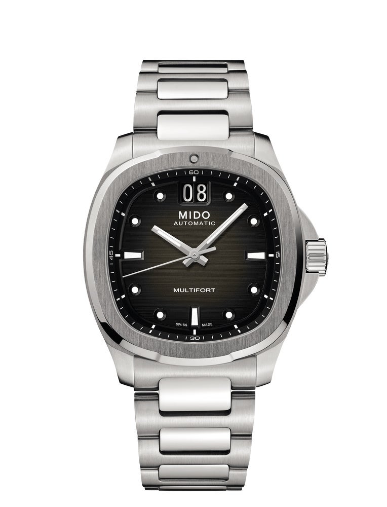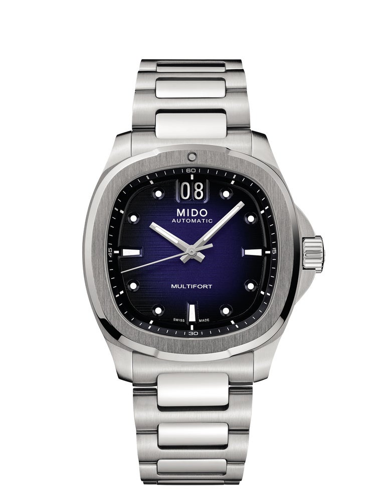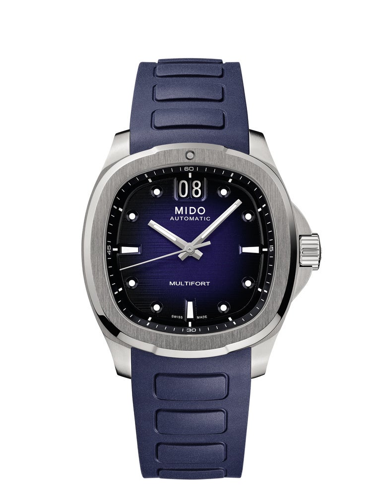 初期のテレビを覚えている人はいるでしょうか。角が丸く控え目なサイズで、正方形に近い長方形の画面。今はほとんど見られることのない形状のデザインでした。ミドーは、1973年、1980年と2000年に、この形状をいくつかのモデルのデザインに採用しています。それから50年、この堂々たる人気を誇るテレビ型ケースが、再びミドーのカタログに登場しました。精密さ、力強さ、大胆さを備えたマルチフォートTVビッグデイトは、ミドの歴史的な時計製造のノウハウを体現し、その豊かな歴史に敬意を表しています。ブルーからブラックへと変化する壮大なグラデーションダイヤルは、針とインデックスにスーパールミノバ®(ホワイト)を使用し、完璧な視認性を実現しています。12時位置には、ミドーを代表する機能であるビッグデイトの開口部を備えています。すでにいくつかのモデルで採用されているこのビッグデイトが、マルチフォート コレクションでデビューを飾ります。最新世代の自動巻きムーブメント、キャリバー80は、耐衝撃性と耐磁性に優れたニヴァクロン™製のハイテクひげゼンマイを搭載しています。この輝かしいフラッシュバックは、マルチフォート コレクションが、より現代的な冒険へと踏み出すための成功裏の帰還を意味しています。
