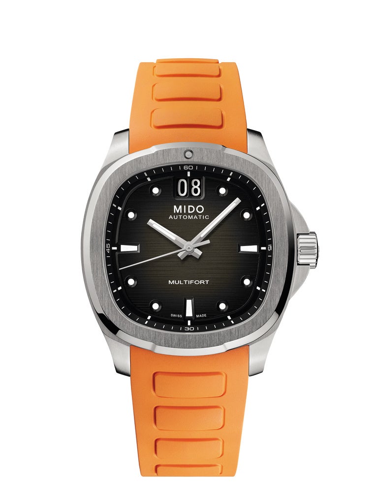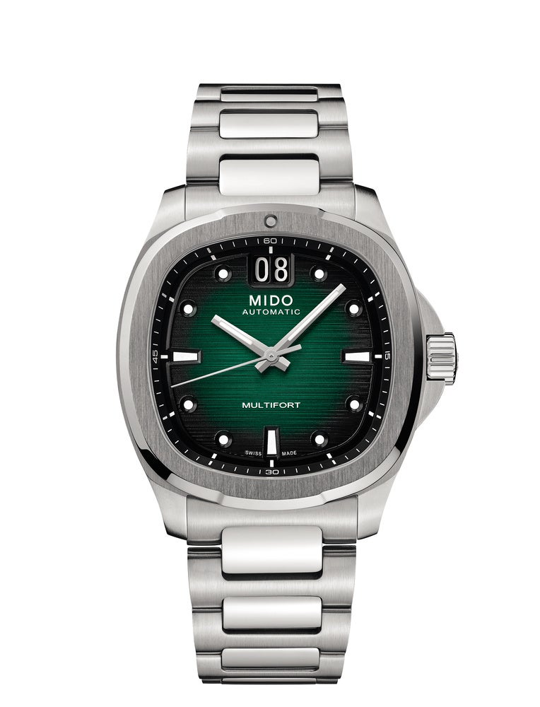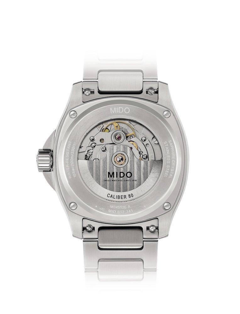 マルチフォートTVビッグデイトのシースルーケースバックからは、コート ド ジュネーブ装飾とミドーのロゴが刻まれたローターを備えたキャリバー80の精巧な歯車を垣間見ることができます。このモデルは最大80時間のパワーリザーブを備えています。耐磁性、耐衝撃性に優れた最先端素材ニヴァクロン™を使用したひげゼンマイを採用し、優れた精度を実現しています。マルチフォートTVビッグデイトは細部に至るまで信頼性が高く、10気圧(100m/330ft)までの防水性を保証しています。このコレクションでは、グリーン、グレー、ブルーの3色のグラデーション文字盤のスチール製のブレスレット3モデルに加え、ネイビーブルーとミドーの代表的なカラーであるオレンジのラバーストラップの2モデル、計5モデルが登場します。